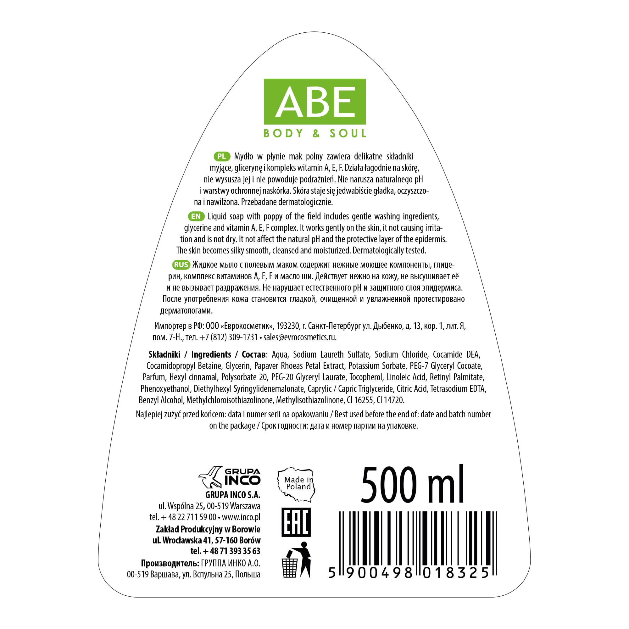 ABE Mydło w płynie mak polny zawiera delikatne składniki myjące, glicerynę i kompleks witamin A, E, F. Działa łagodnie na skórę, nie wysusza jej i nie powoduje podrażnień. Nie narusza naturalnego pH i warstwy ochronnej naskórka. Skora staje się jedwabiście gładka, oczyszczona i nawilżona. Przebadane dermatologicznie.