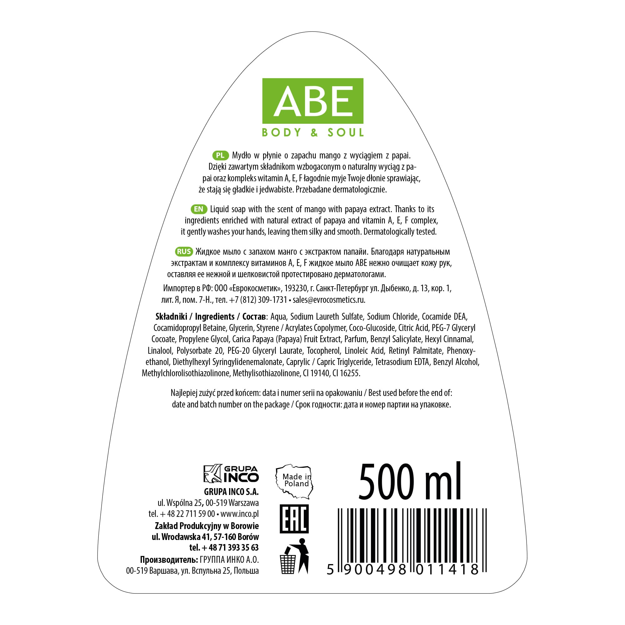 ABE Mydło w płynie mango z wyciągiem z papai. Dzięki zawartym składnikom wzbogaconym o naturalny wyciąg z papai oraz kompleks witamin A, E, F łagodnie myje Twoje dłonie sprawiając, że stają się gładkie i jedwabiste. Przebadane dermatologicznie.