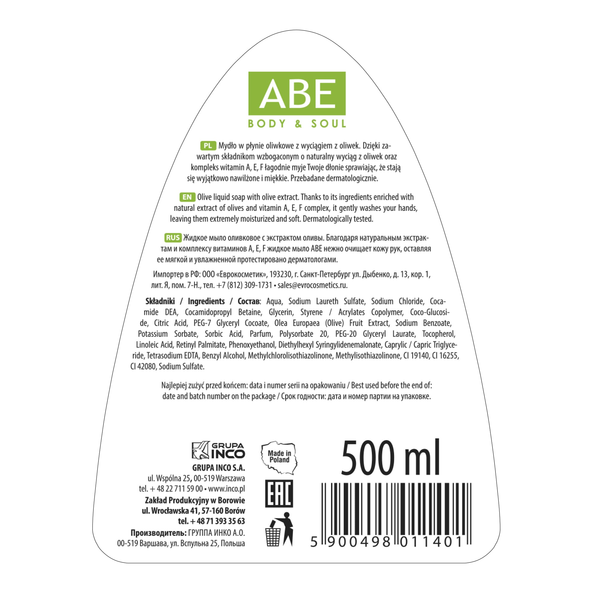 ABE Mydło w płynie oliwkowe z wyciągiem z oliwek. Dzięki zawartym składnikom wzbogaconym o naturalny wyciąg z oliwek oraz kompleks witamin A, E, F łagodnie myje Twoje dłonie sprawiając, że stają się wyjątkowo nawilżone i miękkie. Przebadane dermatologicznie.