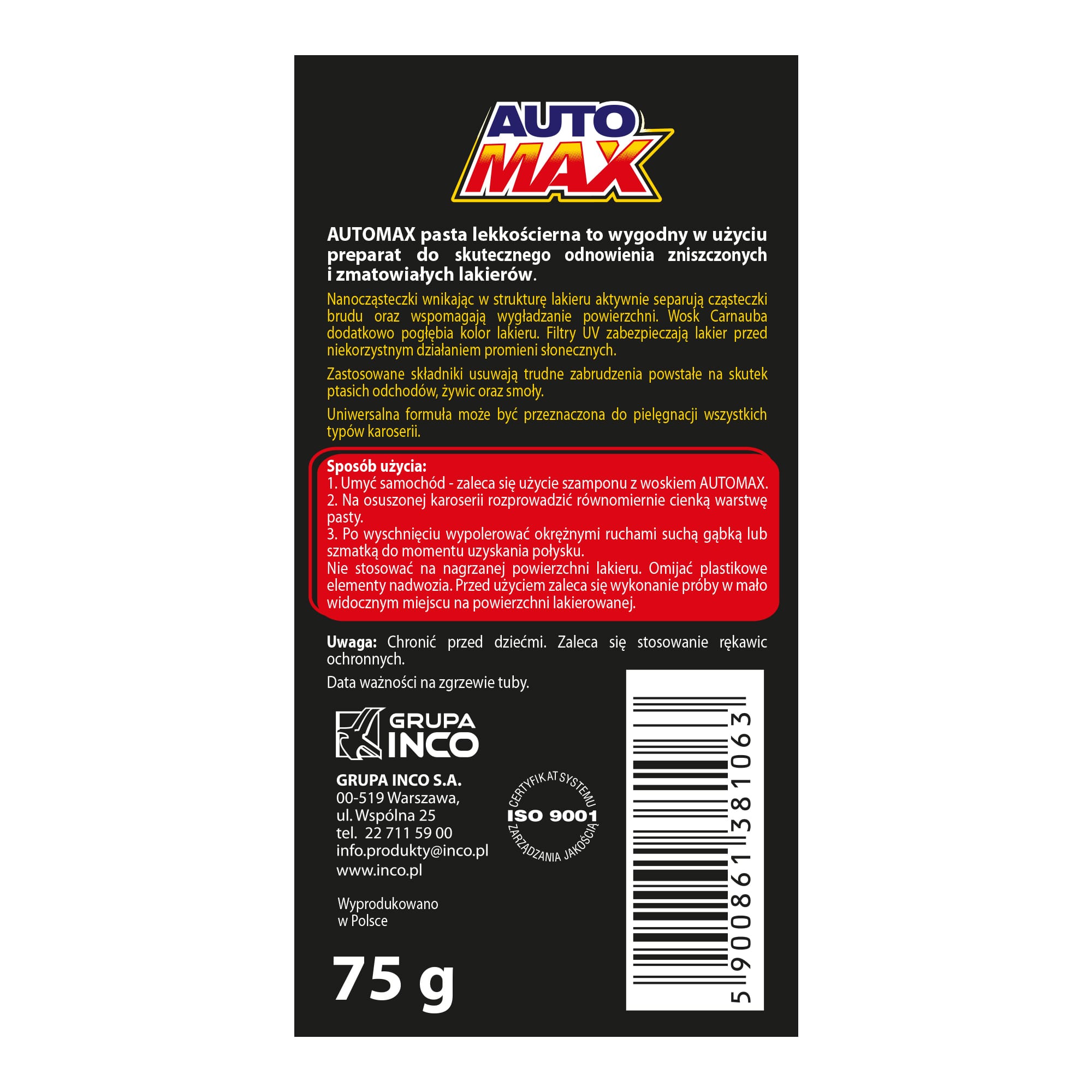AutoMAX pasta lekkościerna to wygodny w użyciu preparat do skutecznego odnowienia zniszczonych i zmatowiałych lakierów. Nanocząsteczki wnikając w strukturę lakieru aktywnie separują cząsteczki brudu oraz wspomagają wygładzanie powierzchni. Wosk Carnauba dodatkowo pogłębia kolor lakieru. Filtry UV zabezpieczają lakier przed niekorzystnym działaniem promieni słonecznych.