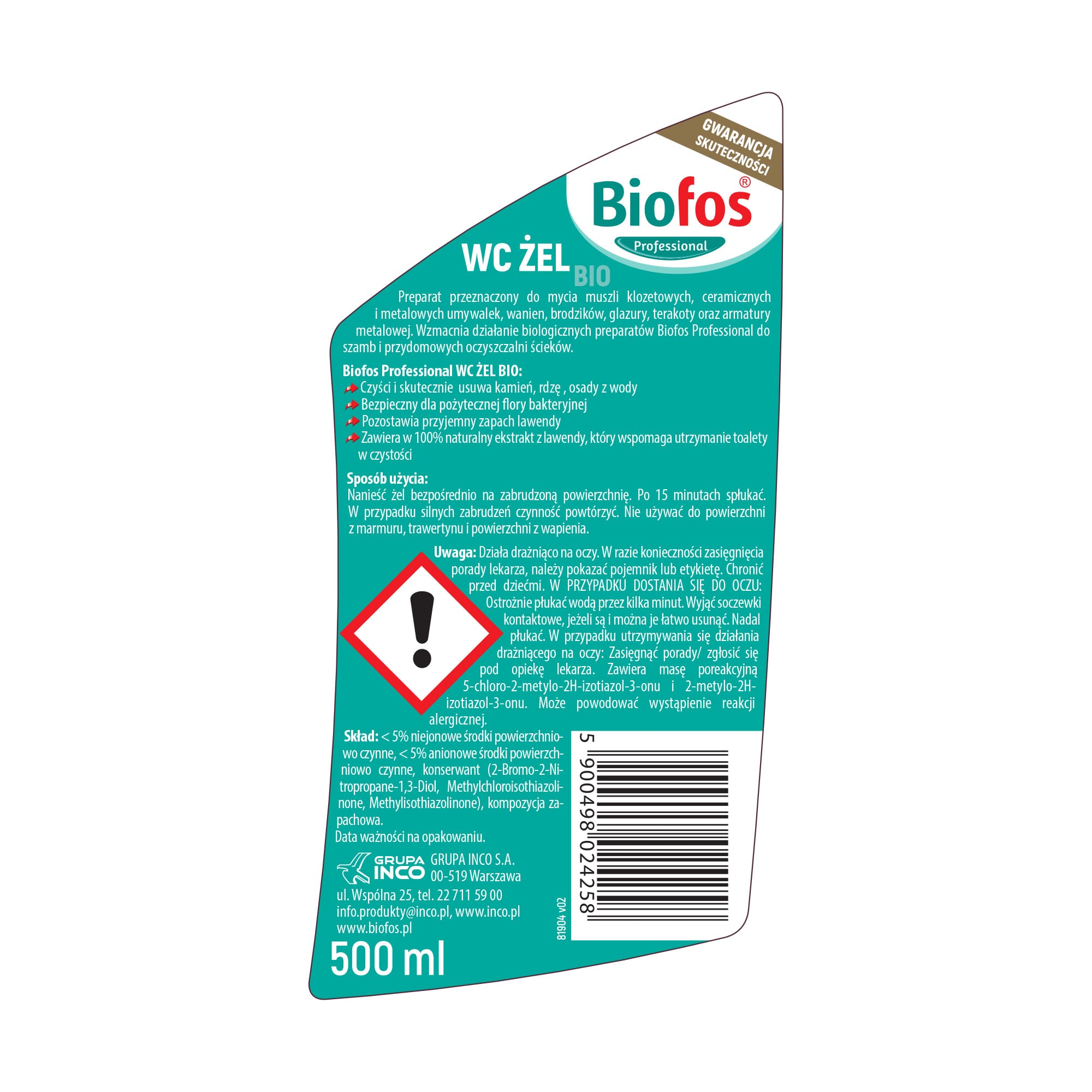 Żel do WC Biofos Professional to preparat biologiczny przeznaczony do mycia muszli klozetowych. Nadaję się także do ceramicznych i metalowych umywalek lub wanien, brodzików, glazury, terakoty oraz armatury metalowej jak również akrylowej.