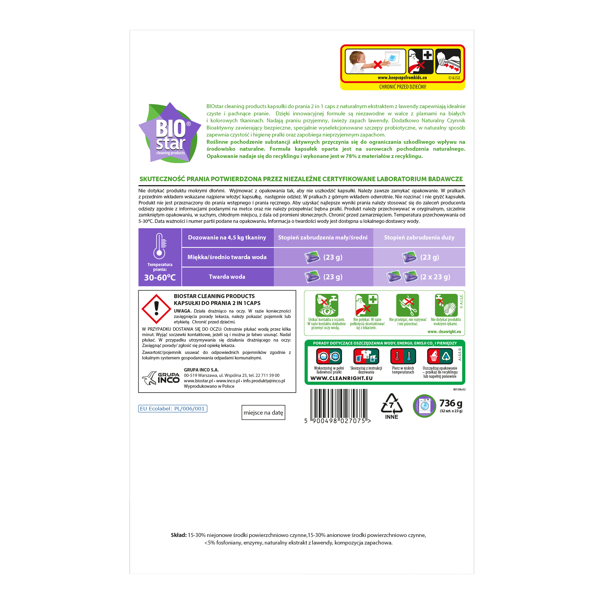 Ekologiczne kapsułki do prania Biostar Cleaning Products 2 w 1 z naturalnym ekstraktem z lawendy. Zapewniają idealnie czyste i pachnące pranie. Dzięki innowacyjnej formule są niezawodne w walce z plamami na białych i kolorowych tkaninach. Naturalny Czynnik Bioaktywny, zawiera bezpieczne, specjalnie wyselekcjonowane szczepy probiotyczne. W naturalny sposób zapewnia czystość i higienę pralki oraz zapobiega nieprzyjemnym zapachom.