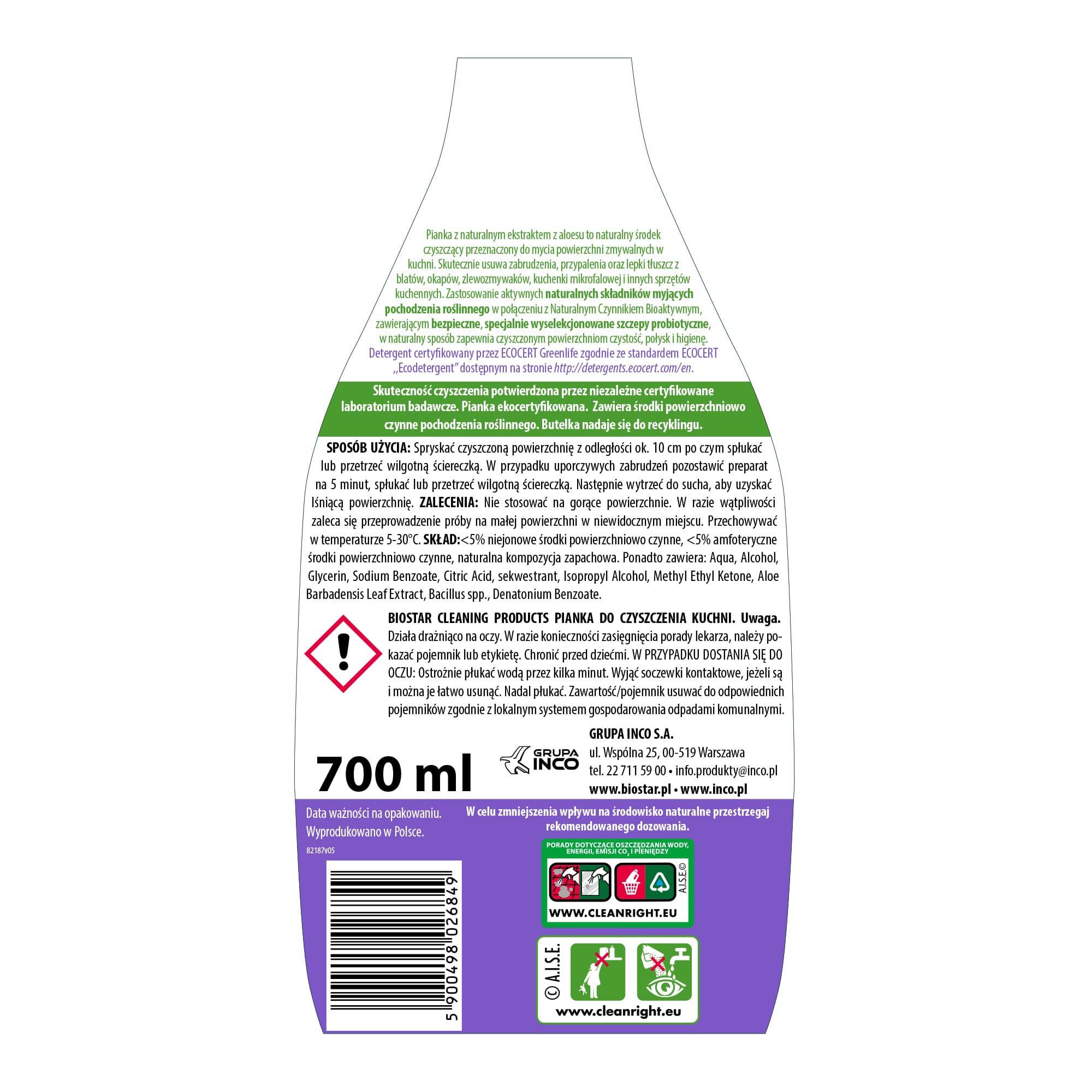 Ekologiczna pianka do kuchni Biostar Cleaning Products z naturalnym ekstraktem z aloesu to naturalny środek czyszczący. Przeznaczony do mycia wszystkich powierzchni zmywalnych w kuchni. Skutecznie usuwa zabrudzenia, przypalenia oraz lepki tłuszcz z blatów, okapów, zlewozmywaków. Także z kuchenki mikrofalowej i innych sprzętów kuchennych.W skład pianki wchodzą naturalne składniki myjące pochodzenia roślinnego oraz Naturalny Czynnik Bioaktywny. Zawiera on bezpieczne, specjalnie wyselekcjonowane szczepy probiotyczne. Dzięki temu pianka w naturalny sposób zapewnia czyszczonym powierzchniom czystość, połysk i higienę.