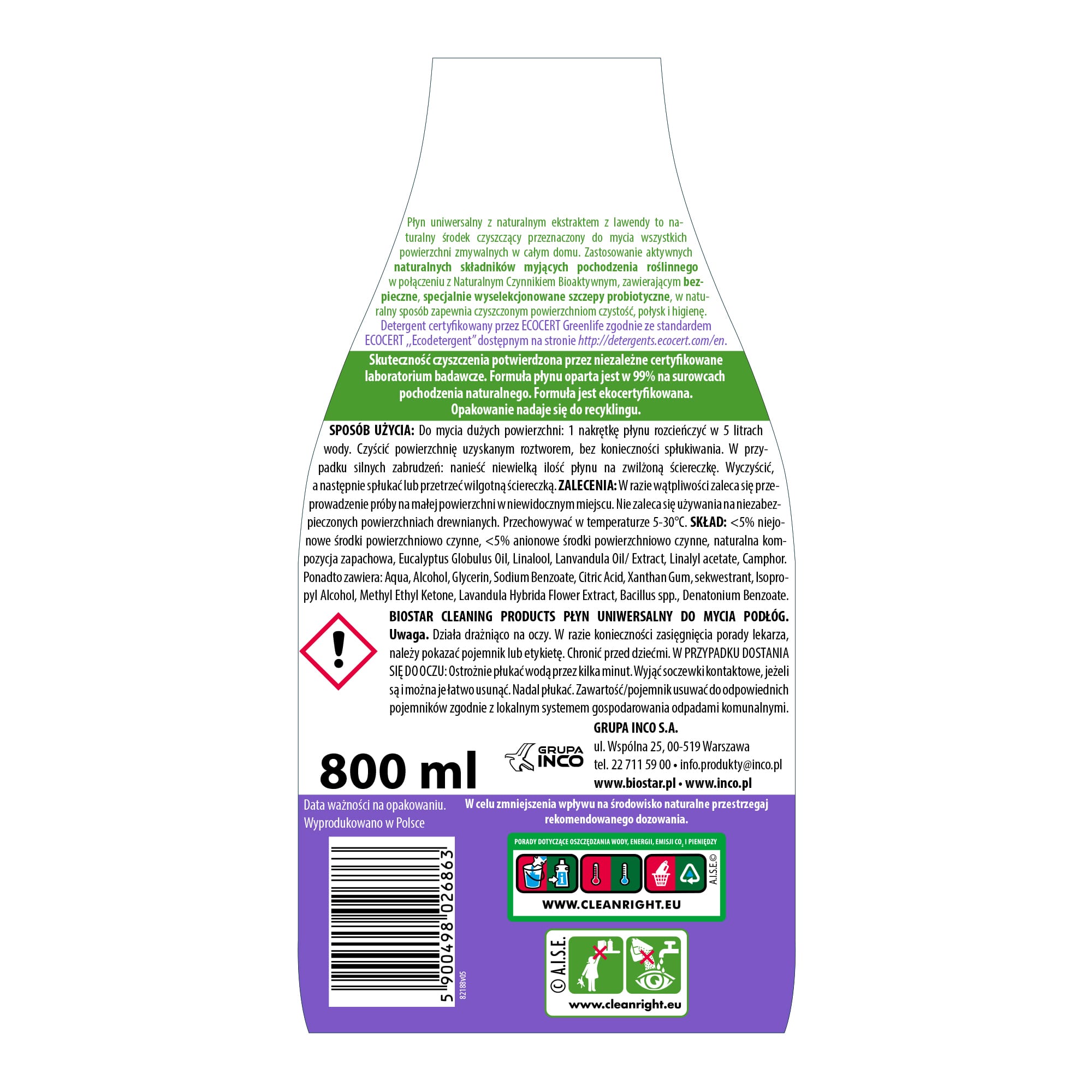 Ekologiczny płyn uniwersalny Biostar Cleaning Products z naturalnym ekstraktem z lawendy. Naturalny środek czyszczący przeznaczony do mycia wszystkich powierzchni zmywalnych w całym domu. Wyjątkowa skuteczność linii BIOstar to siła naturalnych składników czyszczących, naturalne ekstrakty roślinne oraz Naturalny Czynnik Bioaktywny z probiotykami.