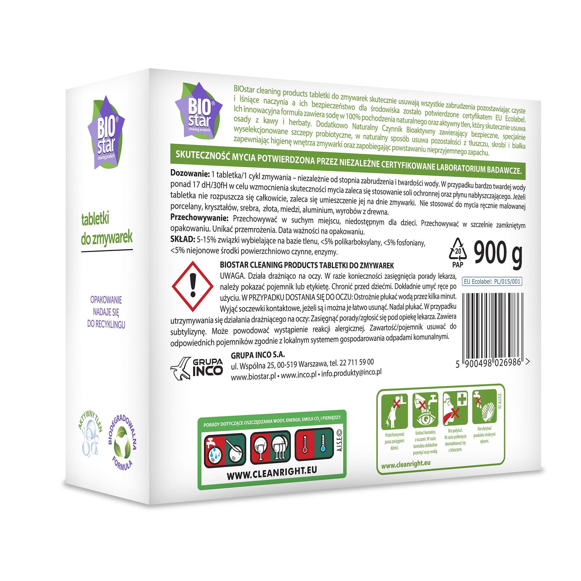 Ekologiczne tabletki do zmywarek Biostar Cleaning Products to ekologiczne, biodegradowalne tabletki w folii rozpuszczalnej. Skutecznie usuwają wszystkie zabrudzenia pozostawiając czyste i lśniące naczynia. Innowacyjna formuła tabletek z naturalną sodą oraz aktywnym tlenem skutecznie usuwa osady z kawy i herbaty. Naturalny Czynnik Bioaktywny ze specjalnie wyselekcjonowanymi pożytecznymi probiotykami, w naturalny sposób usuwa pozostałości z tłuszczu, skrobi i białka. Zapewnia przy tym higienę wnętrza zmywarki oraz zapobiega powstawaniu nieprzyjemnego zapachu.