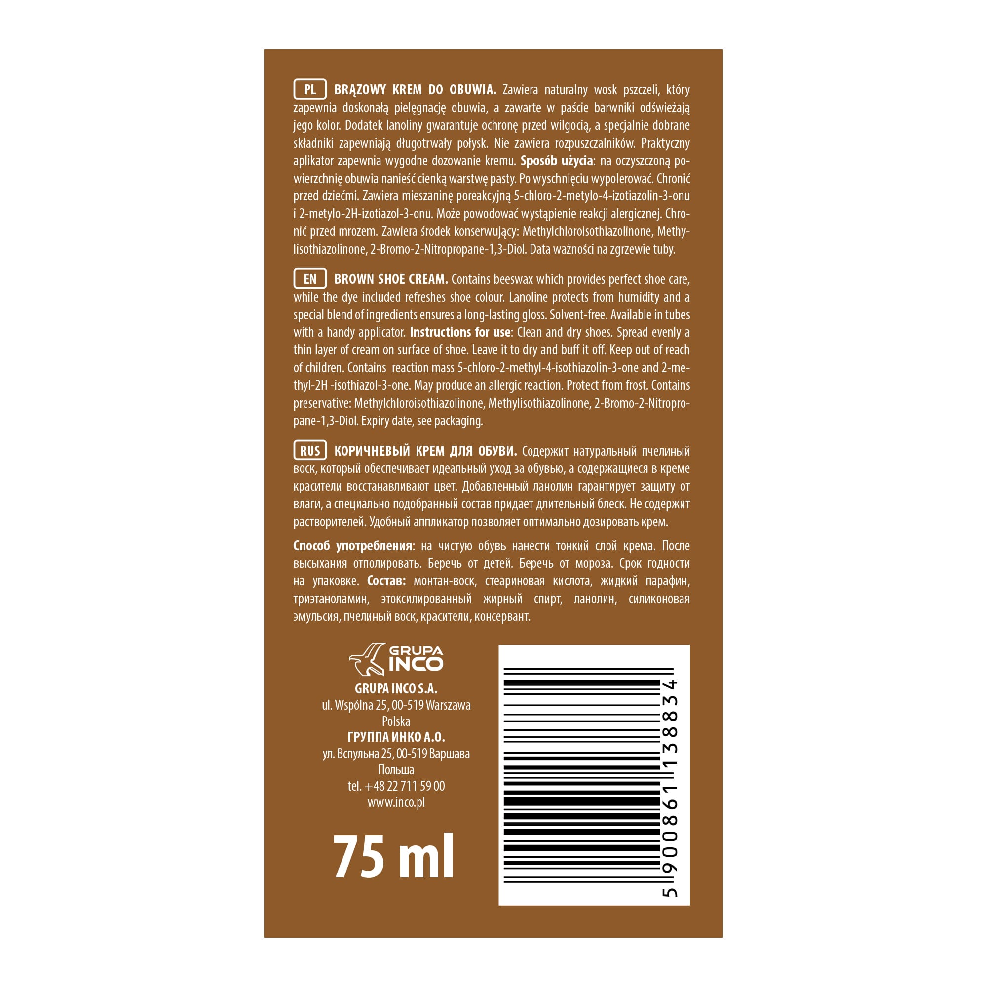 na oczyszczoną powierzchnię obuwia nanieść cienką warstwę pasty. Po wyschnięciu wypolerować.