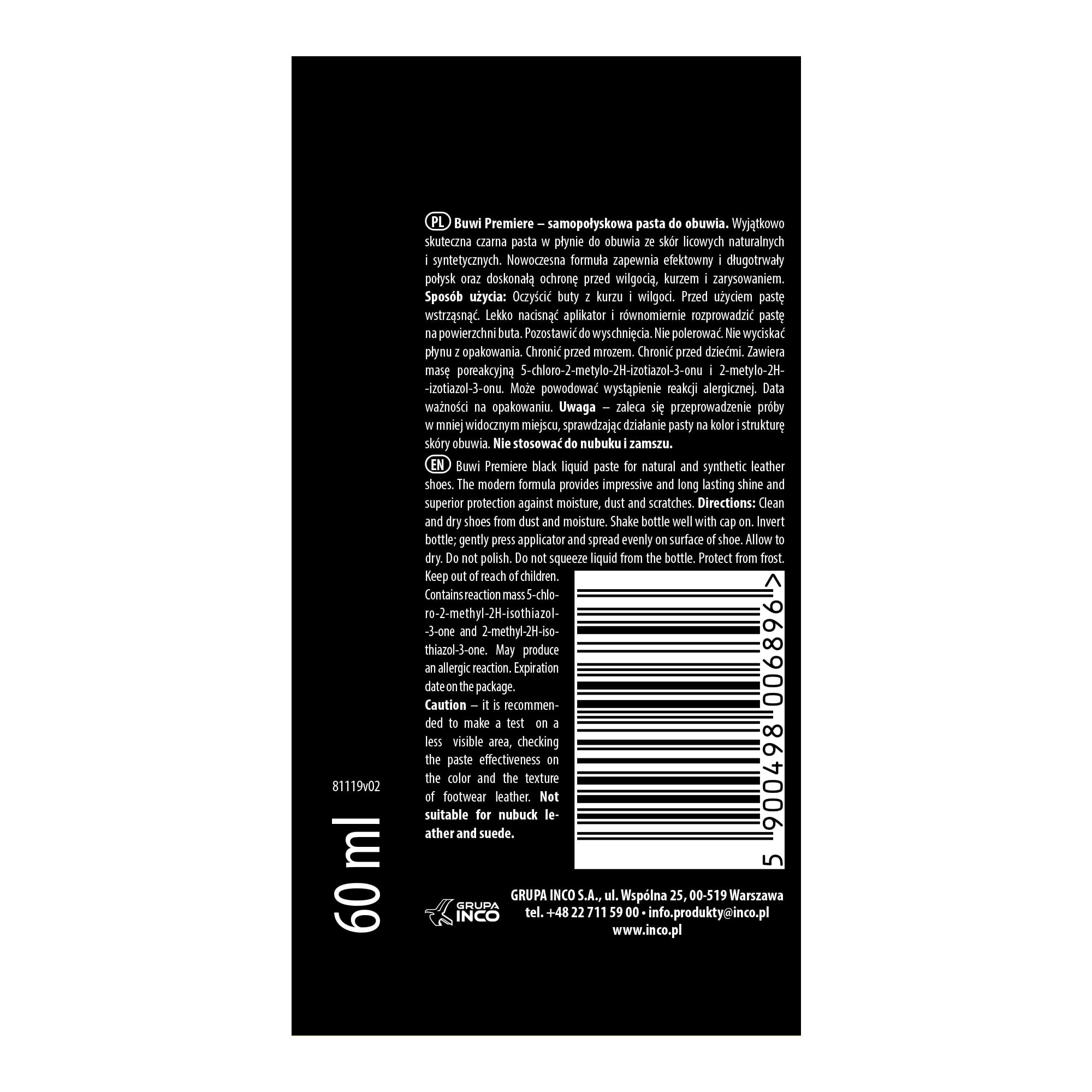 Buwi Premiere samopołyskowa pasta w płynie przeznaczona jest do pielęgnacji obuwia ze skóry naturalnej i sztucznej. Błyskawicznie odświeża i poprawia kolor.. Bez konieczności polerowania nadaje obuwiu pożądany połysk, a dzięki specjalnie dobranym składnikom zapewnia ochronę przed wilgocią. Przy regularnym stosowaniu pasty skóra na długo pozostanie miękka i lśniąca, a nasze buty będą nam służyły na dłużej.