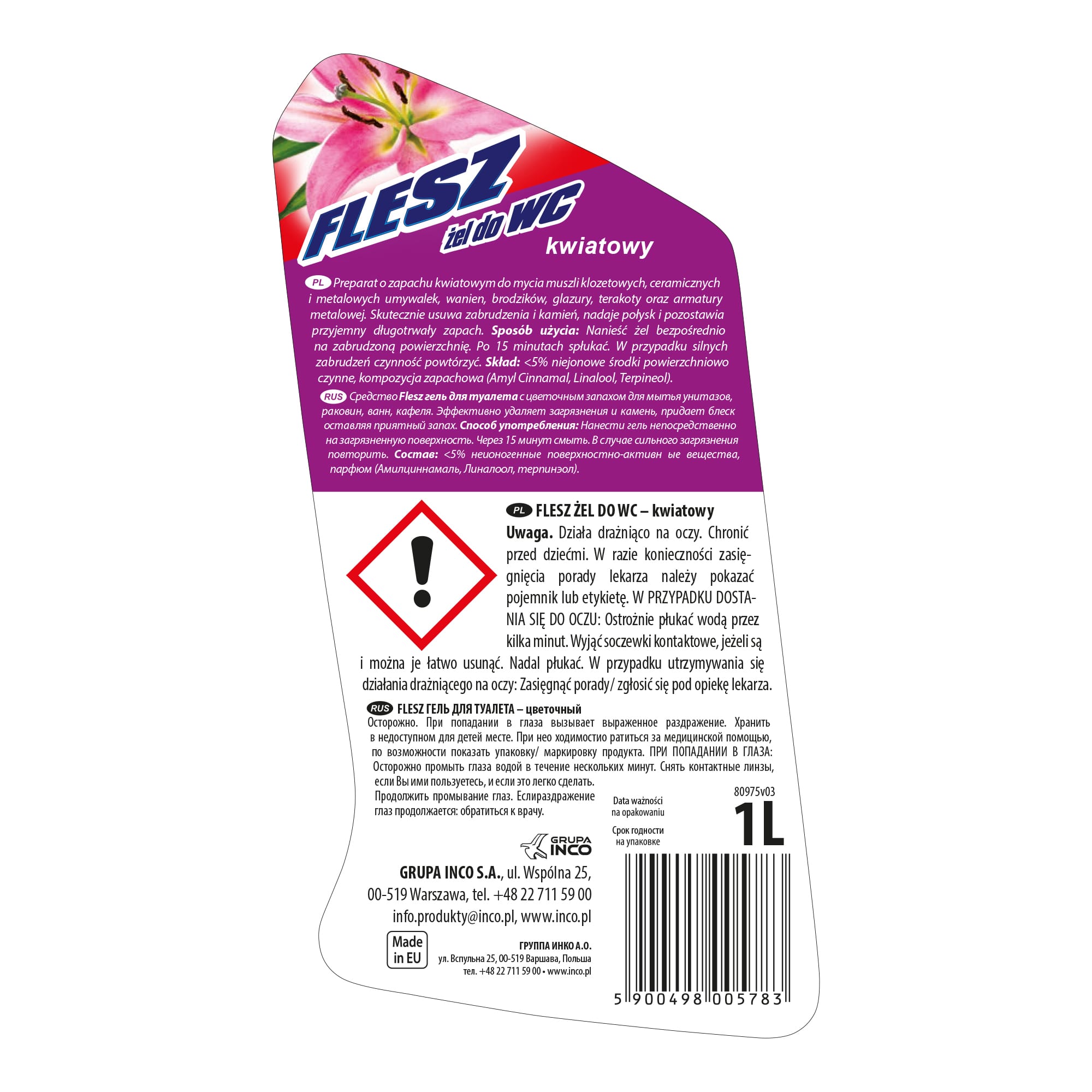 Flesz - żel do WC Floral Power to preparat o przyjemnym zapachu do mycia muszli klozetowych, ceramicznych i metalowych umywalek, wanien, brodzików, glazury, terakoty oraz armatury metalowej. Skutecznie usuwa kamień, rdzę, zacieki, osady, z mydła, tłuste plamy z powierzchni ceramicznych, chromowanych, szklanych oraz stali nierdzewnej w łazience i kuchni. Czyszczone powierzchnie pozostawia czyste i lśniące.