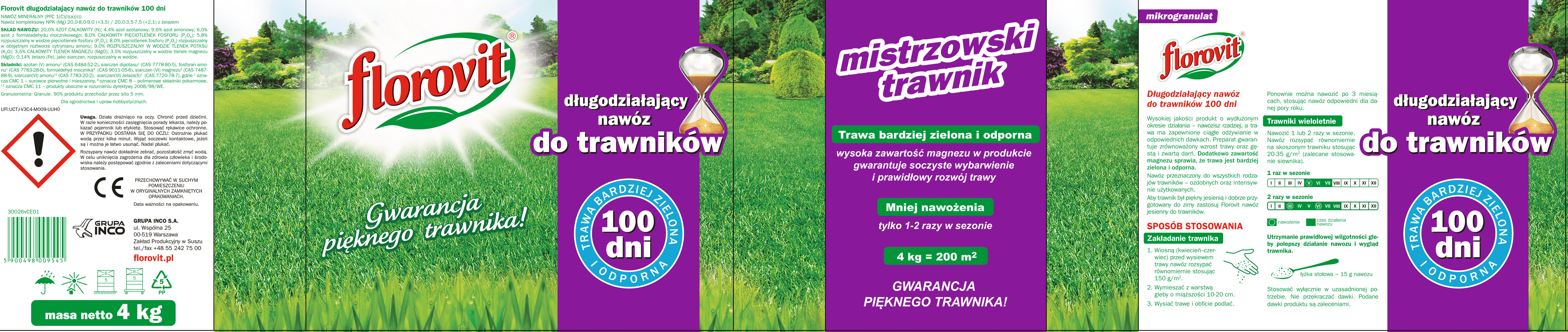 Florovit długodziałający do trawników - nawóz jest przeznaczony do wszystkich rodzajów trawników - ozdobnych oraz intensywnie użytkowanych. Idealny zarówno do zakładania trawników, jak i trawników wieloletnich. Produkt stosuje się tylko 1-2 razy w sezonie. Jedno opakowanie (wiadro 4 kg) wystarcza na 200 m2 trawnika.