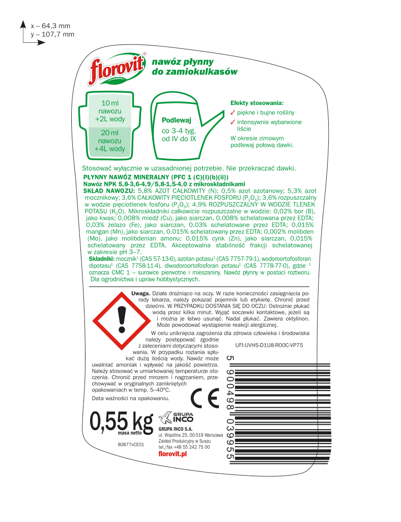 Sposób stosowania Florovit do zamiokulkasów 0,55 kg: