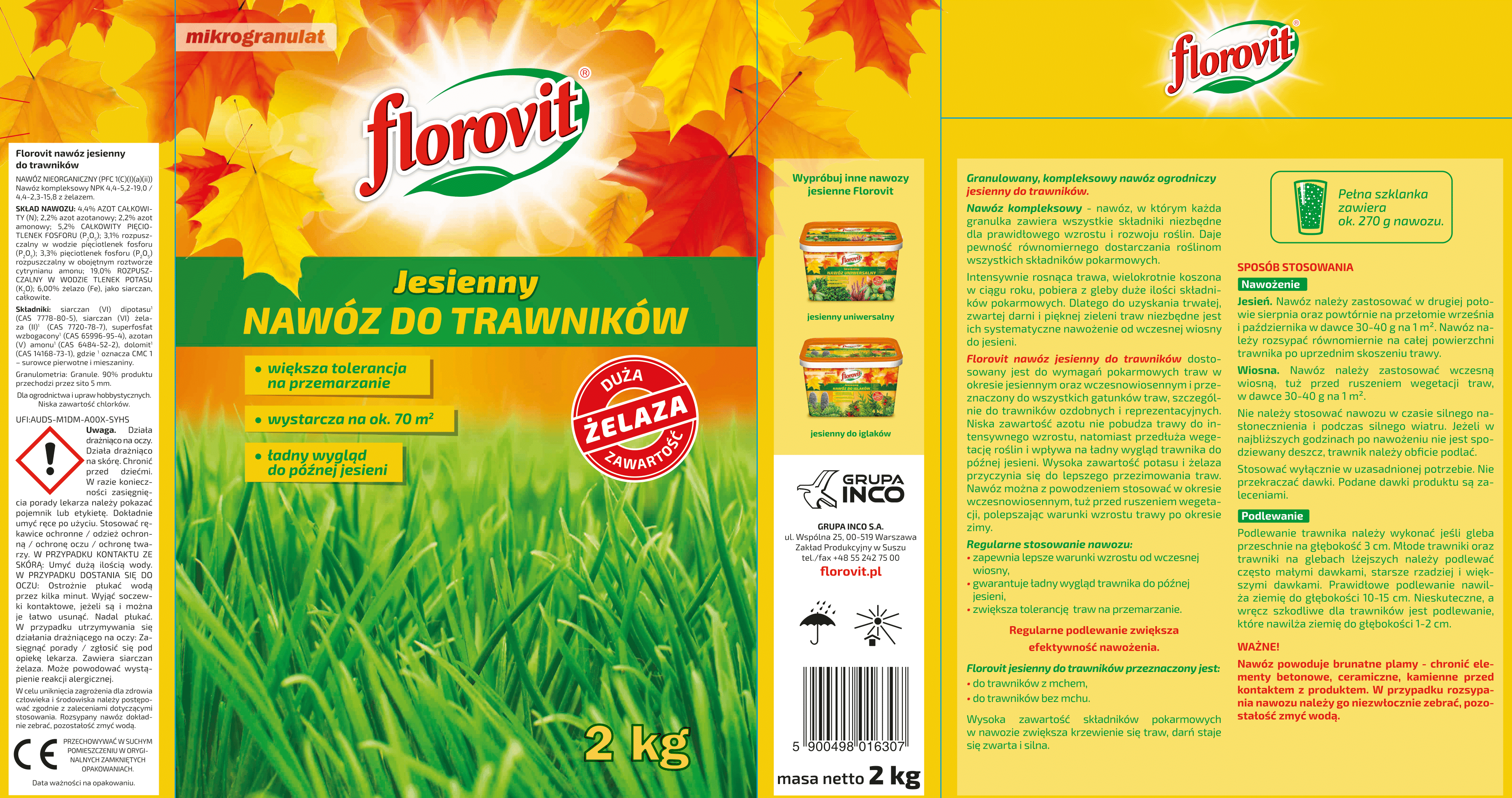Florovit nawóz jesienny do trawnika dostosowany do wymagań pokarmowych traw w okresie jesiennym oraz wczesnowiosennym. Przeznaczony do wszystkich gatunków traw, szczególnie do trawników ozdobnych i reprezentacyjnych. Niska zawartość azotu podana jesienią nie pobudza trawy do intensywnego wzrostu. Za to przedłuża wegetację roślin i wpływa na ładny wygląd trawnika do późnej jesieni. Natomiast wysoka zawartość potasu i żelaza przyczynia się do lepszego ich przezimowania.