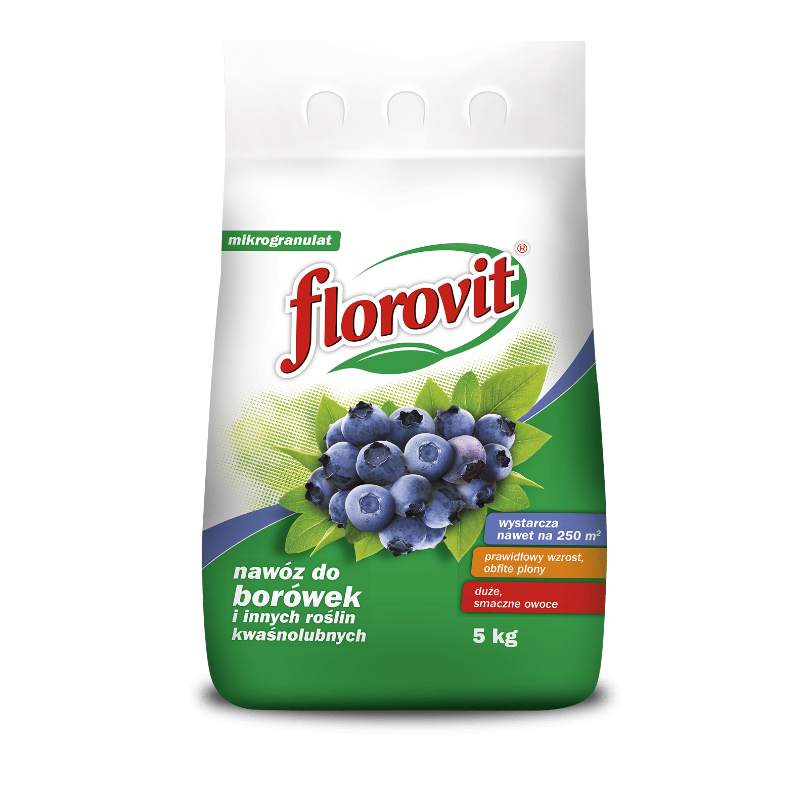 Florovit nawóz do borówek to wieloskładnikowy, mineralny nawóz doglebowy. Przeznaczony do pogłównego dokarmiania borówek w pierwszym roku po posadzeniu i w dalszych latach uprawy. Ważną zaletą Florovitu do borówek jest zdolność zakwaszania gleby, co wyraźnie sprzyja wzrostowi i rozwojowi roślin wymagających stanowiska o niskim odczynie podłoża. Nawóz zapobiega także chlorozie liści w okresie wegetacji roślin. Ponadto zastosowano w nim słabo przemieszczające się w glebie formy składników pokarmowych, co zabezpiecza je przed wymywaniem do wód gruntowych.