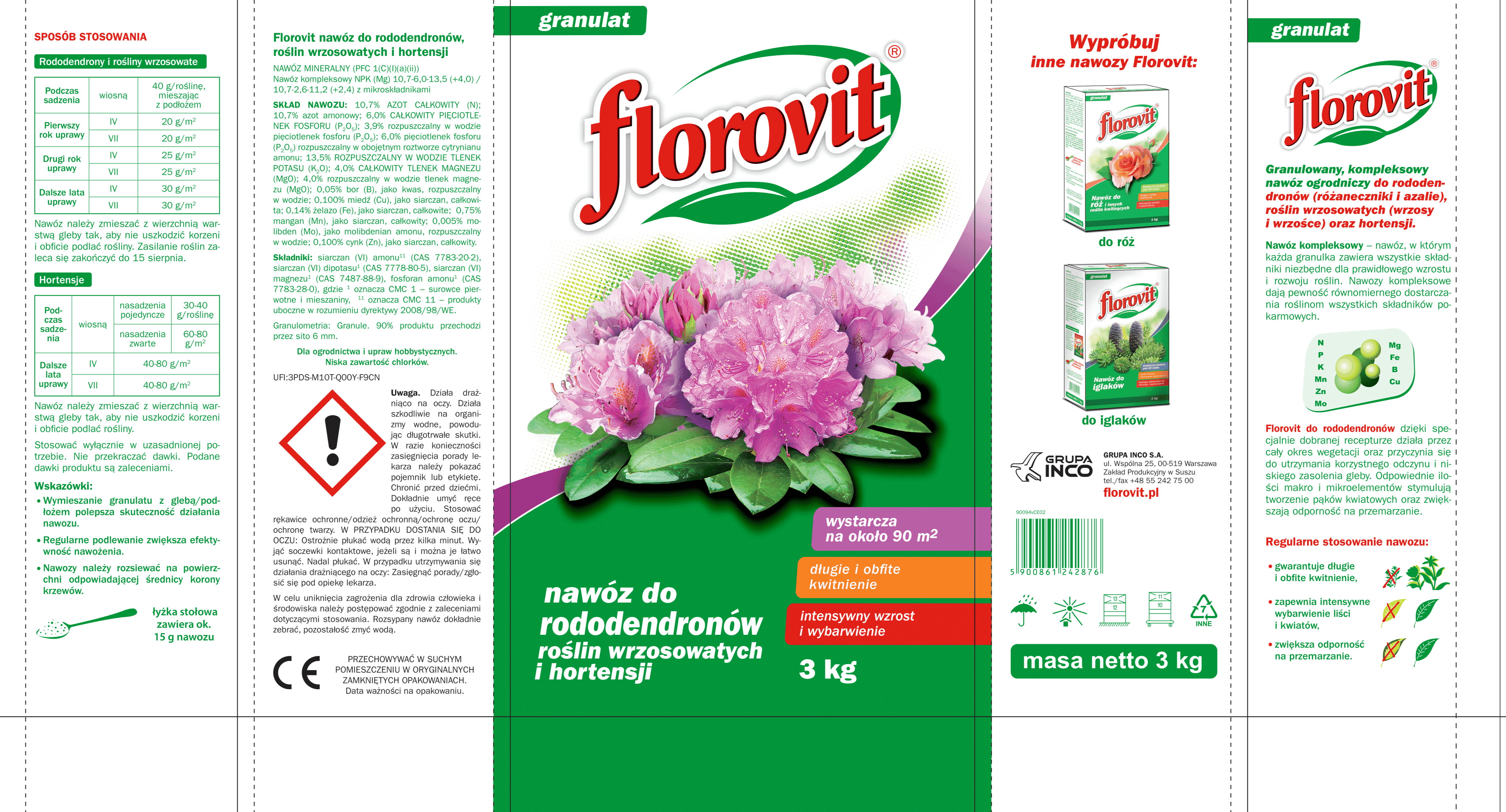 Florovit nawóz do rododendronów (różaneczniki i azalie) oraz roślin wrzosowatych dzięki specjalnie dobranej recepturze działa przez cały okres wegetacji. Przyczynia się także do utrzymania korzystnego odczynu gleby i niskiego jej zasolenia.