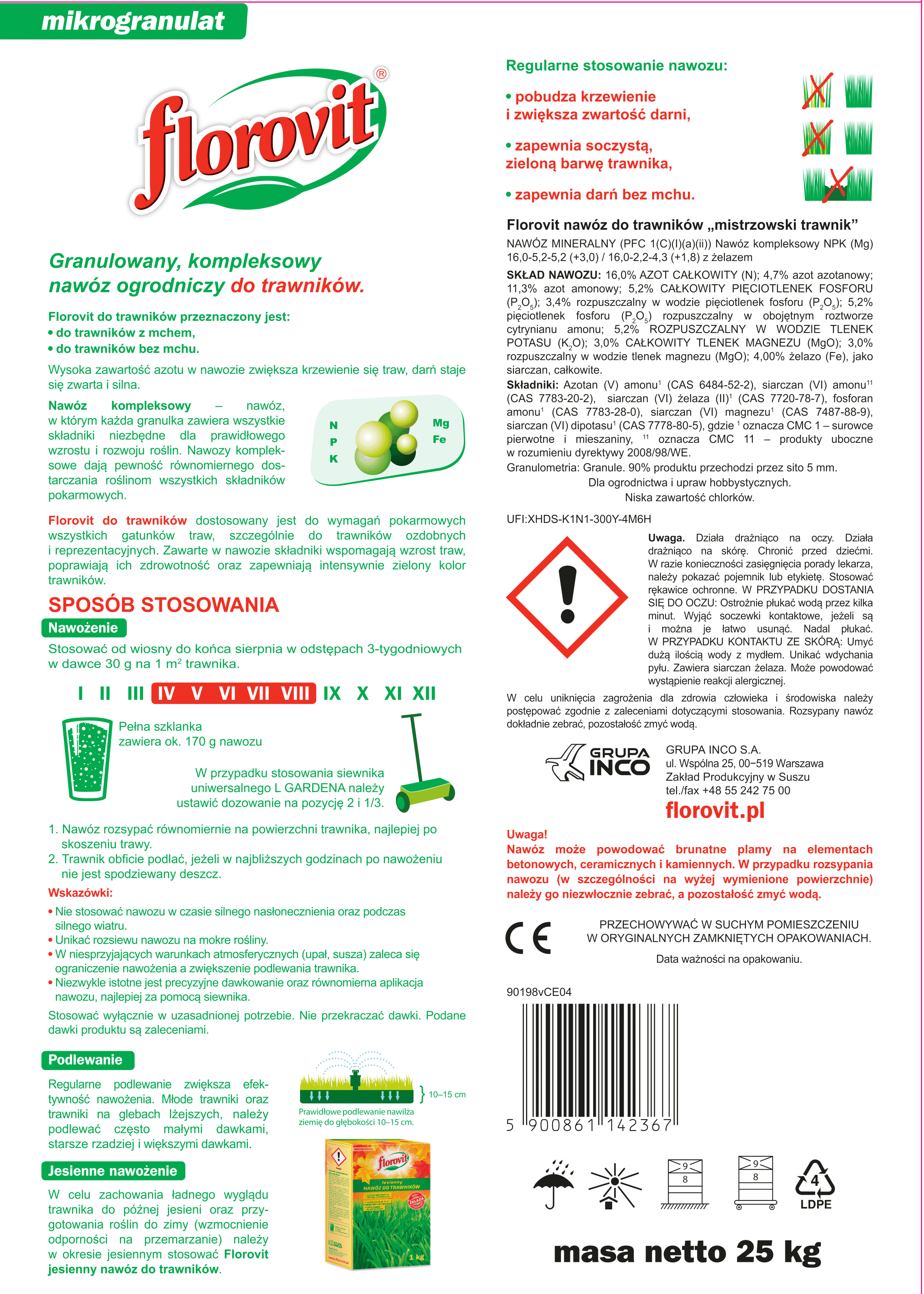 Wysoka zawartość azotu w nawozie zwiększa również krzewienie się traw. Darń staje się zwarta i silna, co przeciwdziała wzrostowi mchu i zachwaszczeniu. Florovit nawóz do trawnika Mistrzowski trawnik jest skuteczny, wydajny oraz wygodny w stosowaniu.