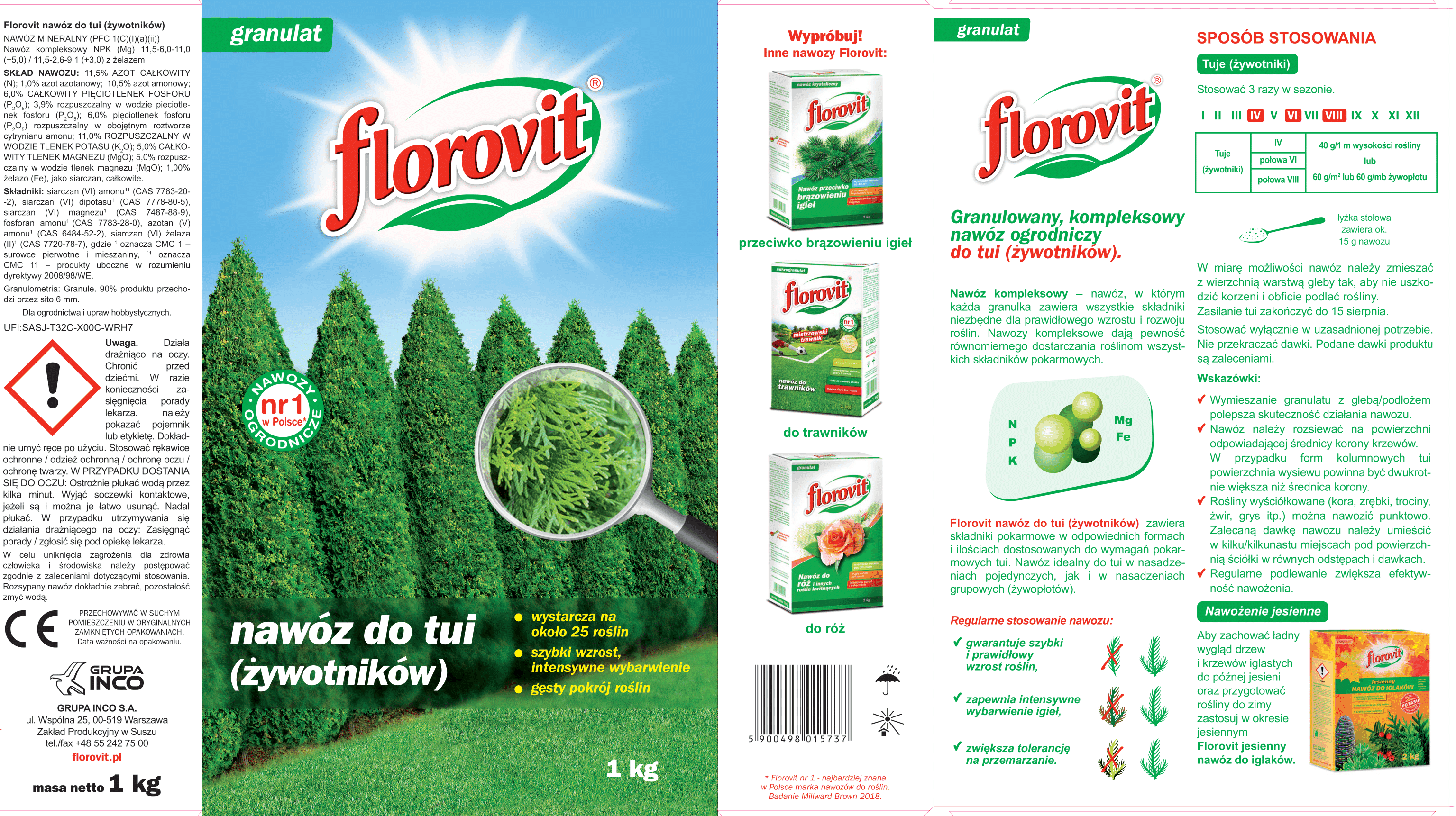 Florovit nawóz do tui (żywotników) 1 kg zawiera składniki pokarmowe w odpowiednich formach i ilościach, które są dostosowanych do wymagań pokarmowych tui. I dlatego nawóz ten jest idealny dla tui w nasadzeniach pojedynczych jak i w nasadzeniach grupowych (żywopłotów).