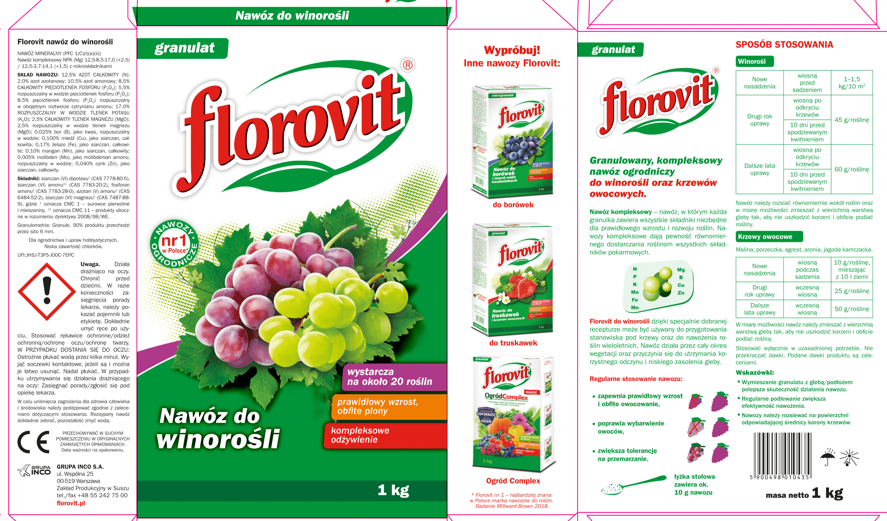 Florovit nawóz do winorośli to wieloskładnikowy, doglebowy nawóz mineralny. Przydatny do przygotowania stanowiska pod winorośl oraz do nawożenia pogłównego krzewów już rosnących. Dzięki specjalnej recepturze działa przez cały okres wegetacji. W niewielkim stopniu wpływa na obniżenie odczynu gleby, co sprzyja dobrej dostępności mikroelementów. Florovit do winorośli zawiera naturalne kopaliny, co czyni go bardziej przyjaznym dla środowiska. Nie zawiera azotanów. Chociaż winorośl można uprawiać niemal na każdej glebie, roślina ta wyraźnie reaguje na nawożenie.