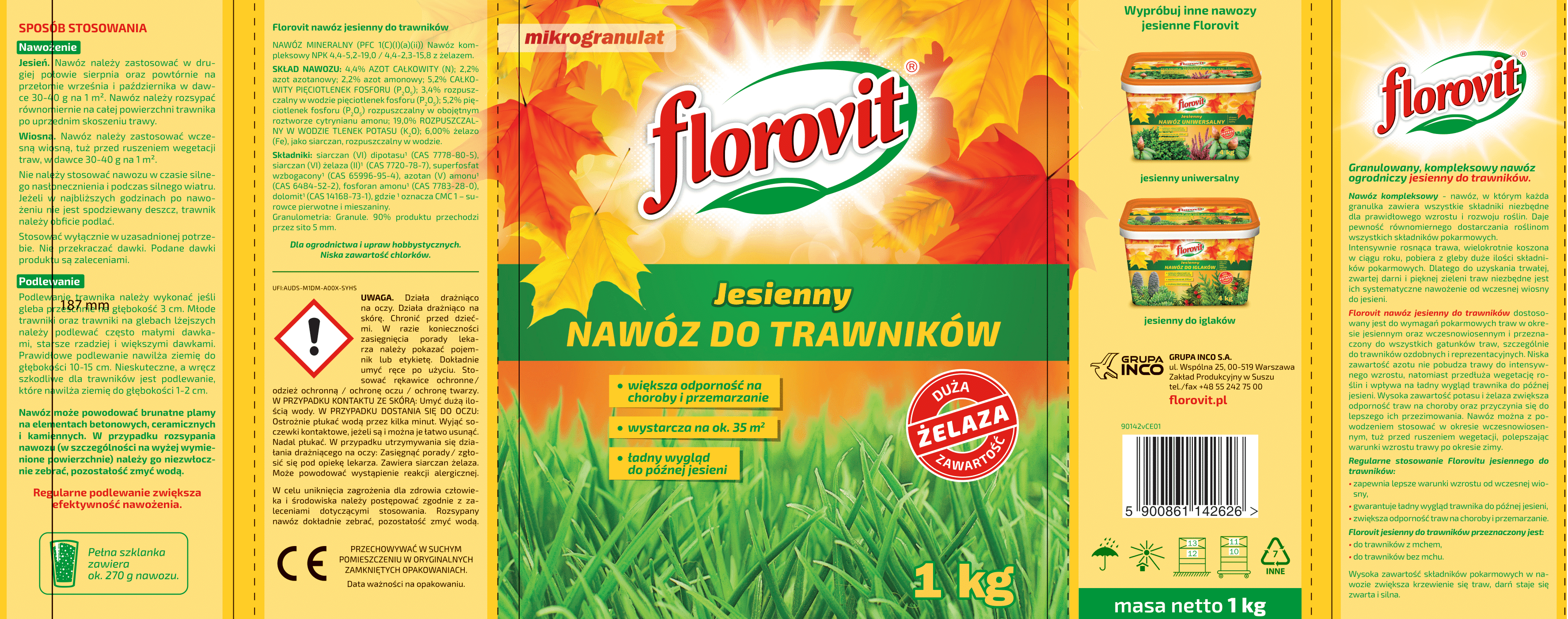 Florovit nawóz jesienny do trawnika dostosowany do wymagań pokarmowych traw w okresie jesiennym oraz wczesnowiosennym. Przeznaczony do wszystkich gatunków traw, szczególnie do trawników ozdobnych i reprezentacyjnych. Niska zawartość azotu podana jesienią nie pobudza trawy do intensywnego wzrostu. Za to przedłuża wegetację roślin i wpływa na ładny wygląd trawnika do późnej jesieni. Natomiast wysoka zawartość potasu i żelaza przyczynia się do lepszego ich przezimowania.