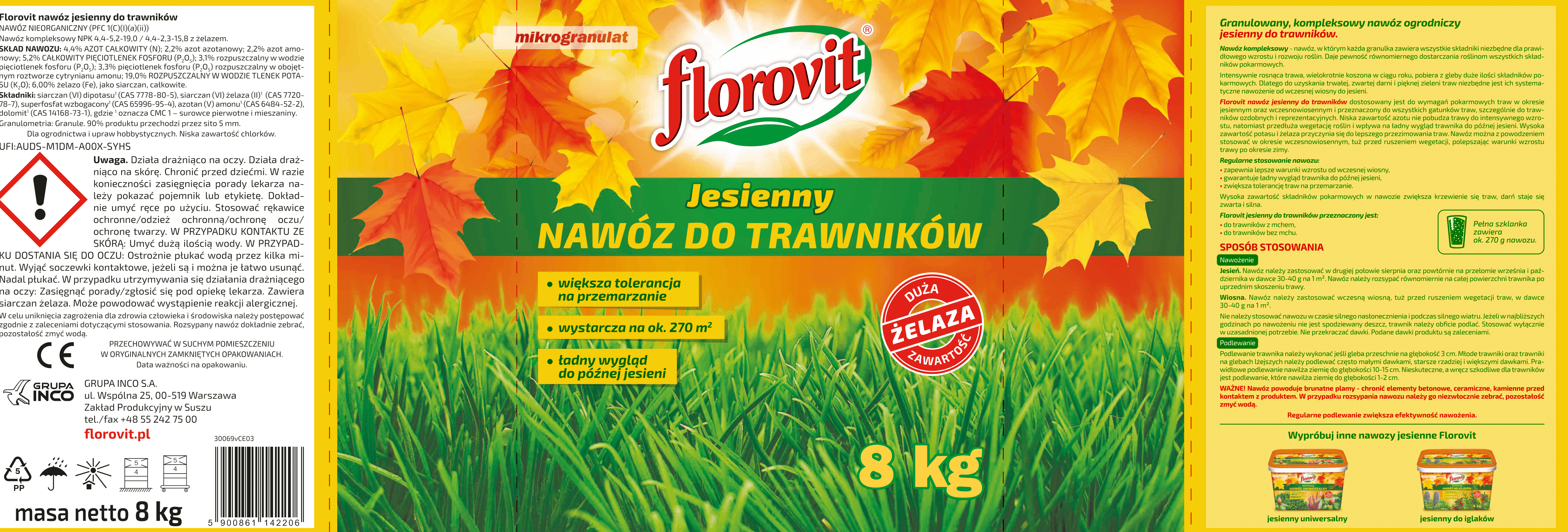 Florovit nawóz jesienny do trawnika dostosowany do wymagań pokarmowych traw w okresie jesiennym oraz wczesnowiosennym. Przeznaczony do wszystkich gatunków traw, szczególnie do trawników ozdobnych i reprezentacyjnych. Niska zawartość azotu podana jesienią nie pobudza trawy do intensywnego wzrostu. Za to przedłuża wegetację roślin i wpływa na ładny wygląd trawnika do późnej jesieni. Natomiast wysoka zawartość potasu i żelaza przyczynia się do lepszego ich przezimowania.