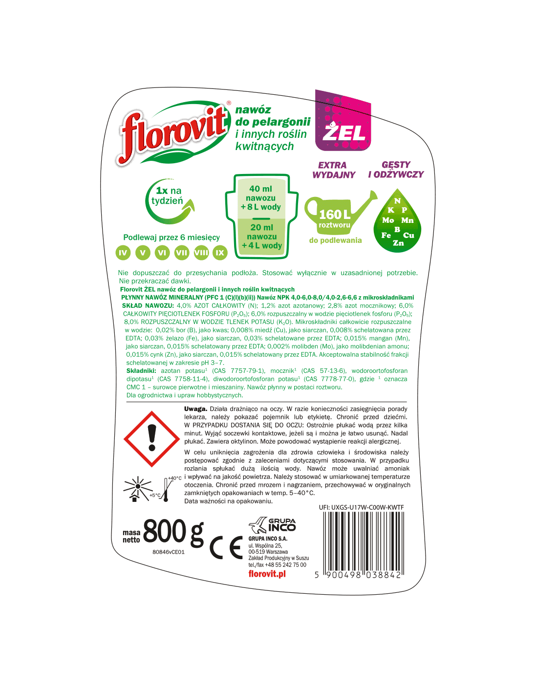 Florovit nawóz do pelargonii i innych roślin kwitnących w żelu 800 g