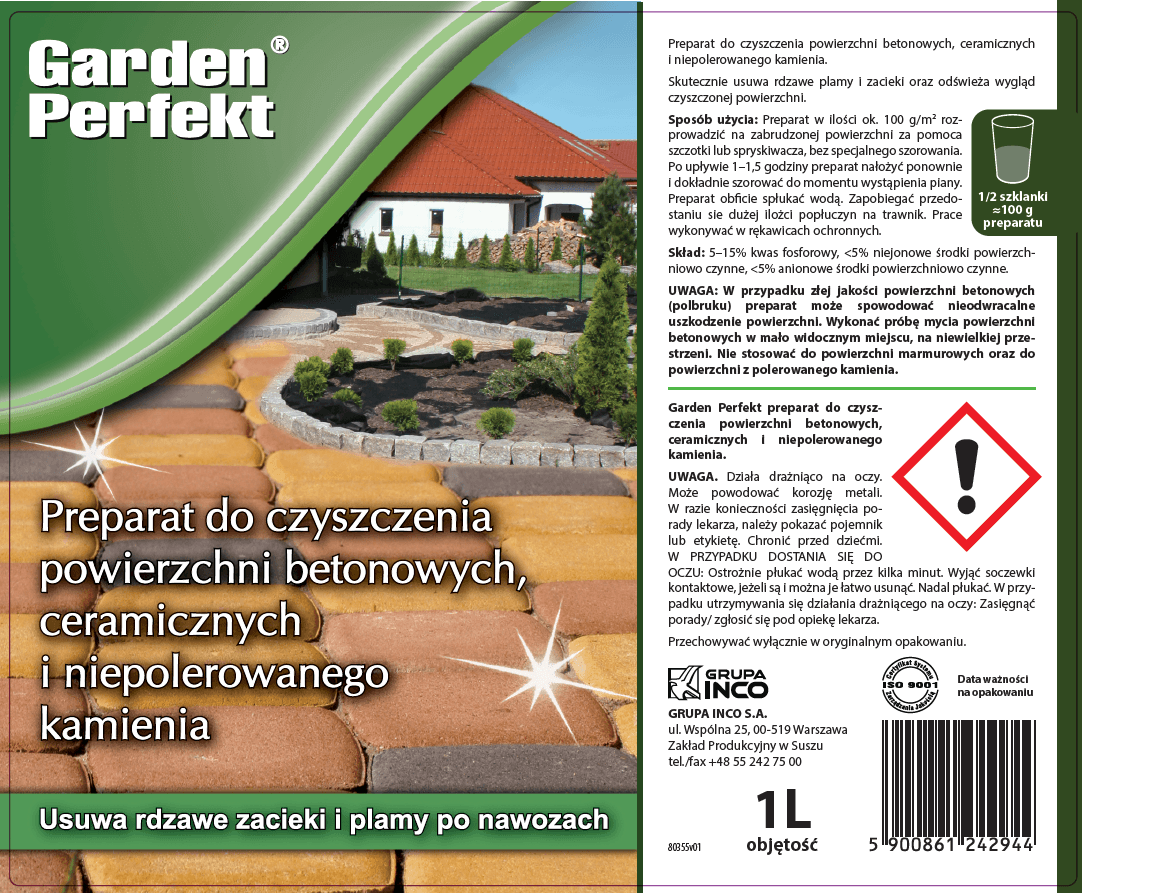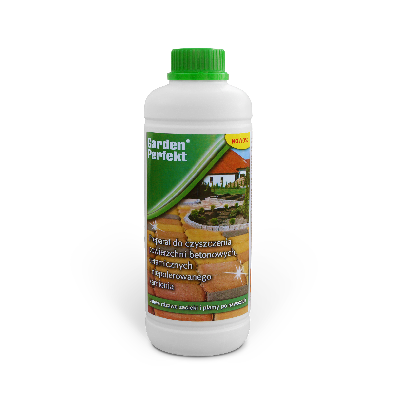 Garden Perfekt do usuwania rdzy z kostki brukowej. Czyści zabrudzenia betonu, kostki brukowej, kamienia. Garden Perfekt skutecznie usuwa rdzawe plamy i zacieki oraz odświeża wygląd czyszczonej powierzchni. Preparat usuwa także plamy po nawozach powstałe na powierzchniach betonowych, (polbruku), także kostki brukowej betonowej oraz kamiennej.
