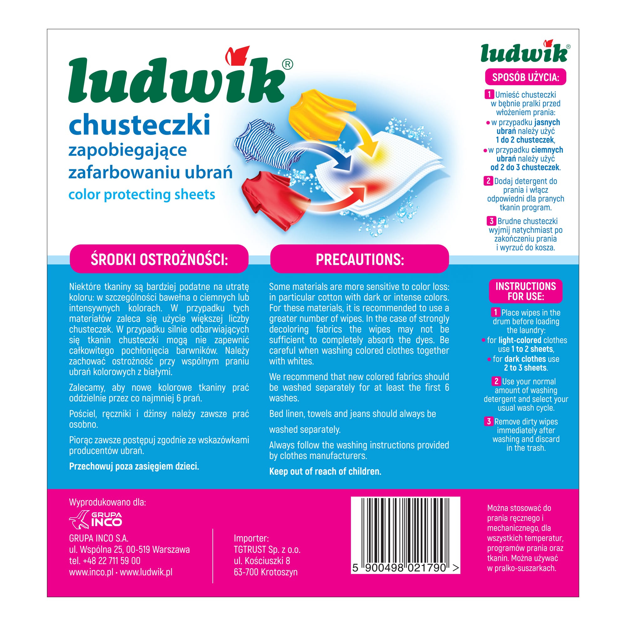 Ludwik chusteczki zapobiegające zafarbowaniu ubrań skutecznie wyłapują uwolnione do wody podczas prania barwniki z tkanin oraz wspomagają usuwanie brudu. Dzięki nim ubrania zachowują oryginalne kolory.