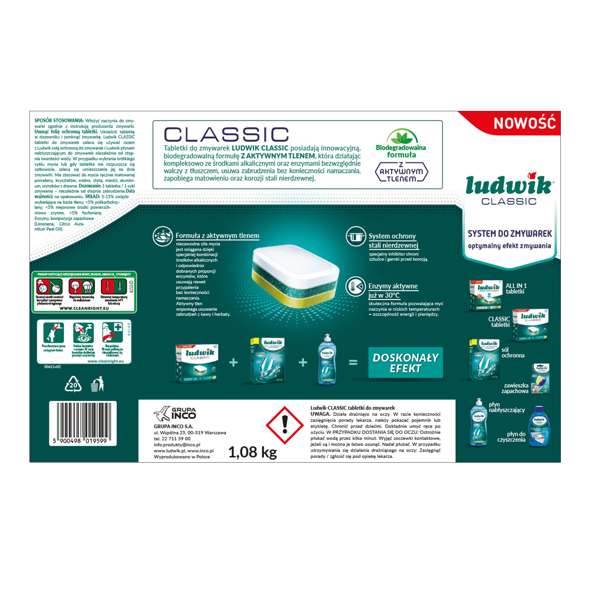 Tabletki do zmywarek Ludwik Classic w folii rozpuszczalnej zapewniają wysoką skuteczność mycia. Posiadają innowacyjną formułę Active Oxy Power. Chronią stal nierdzewną przed matowieniem. Pozostawiają także świeży cytrynowy zapach.