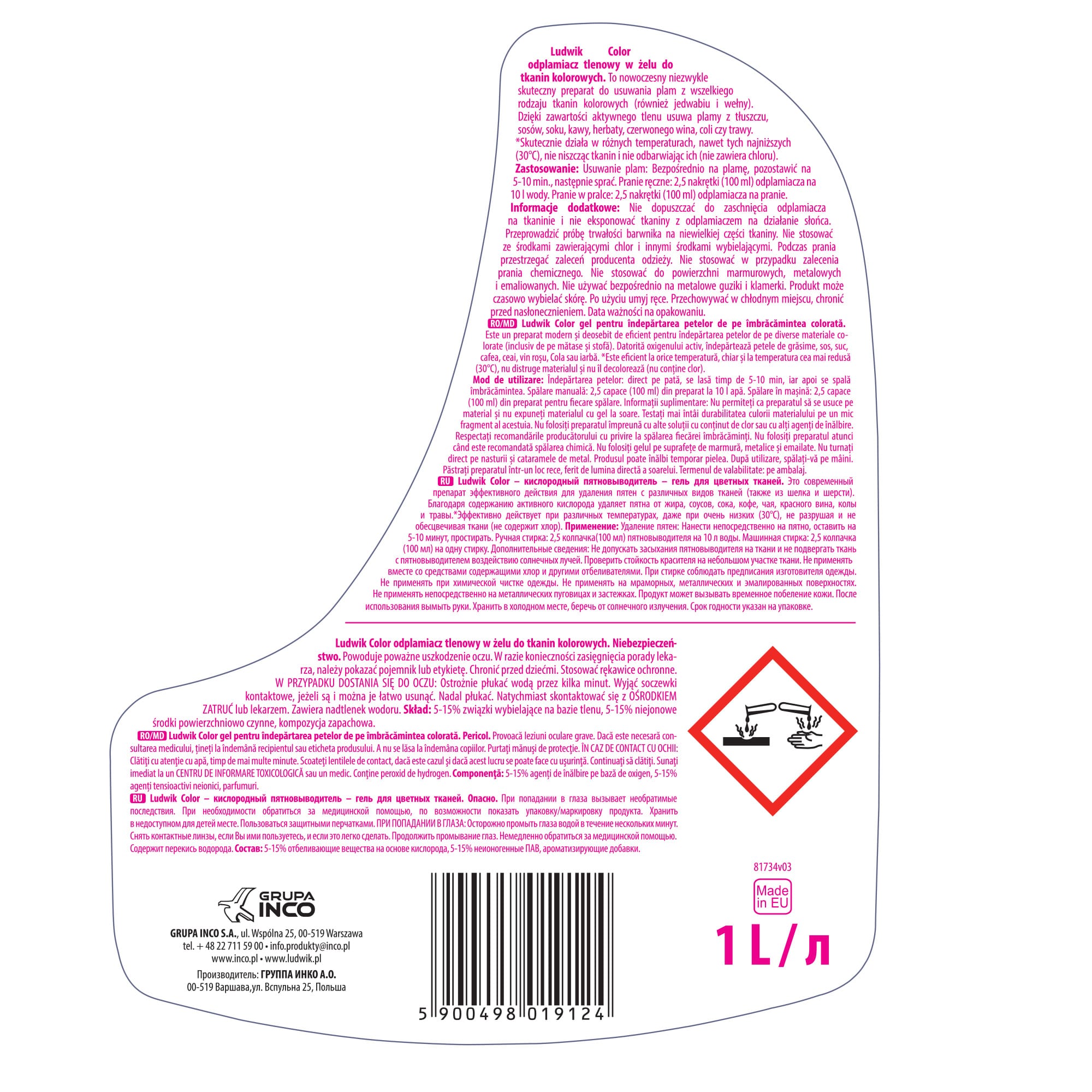 Ludwik Color odplamiacz do tkanin kolorowych w żelu. Usuwa plamy, nie odbarwia tkanin. Bezpieczny dla tkanin (z wyjątkiem wełny i lnu). Nie zawiera chloru i szkodliwych fosforanów.