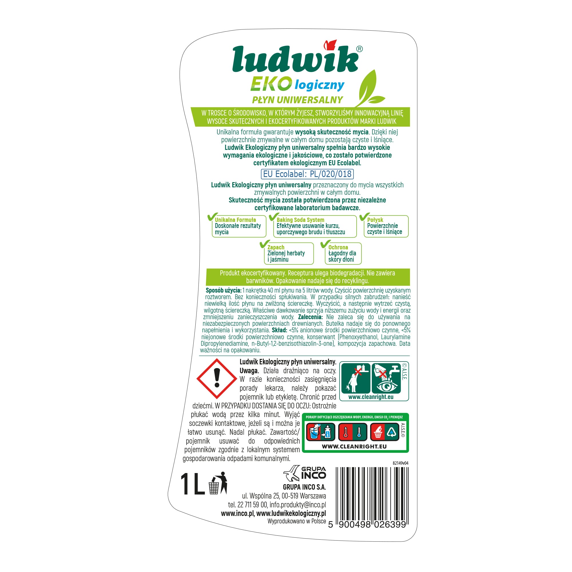 Ludwik Ekologiczny płyn uniwersalny o przyjemnym zapachu zielonej herbaty i jaśminu. Biodegradowalny, bez szkodliwych substancji chemicznych. Skutecznie usuwa zabrudzenia, ślady i kurz. Dzięki specjalnej formule Baking Soda System, skutecznie radzi sobie z zabrudzeniami, pozostawiając czyste i lśniące powierzchnie.