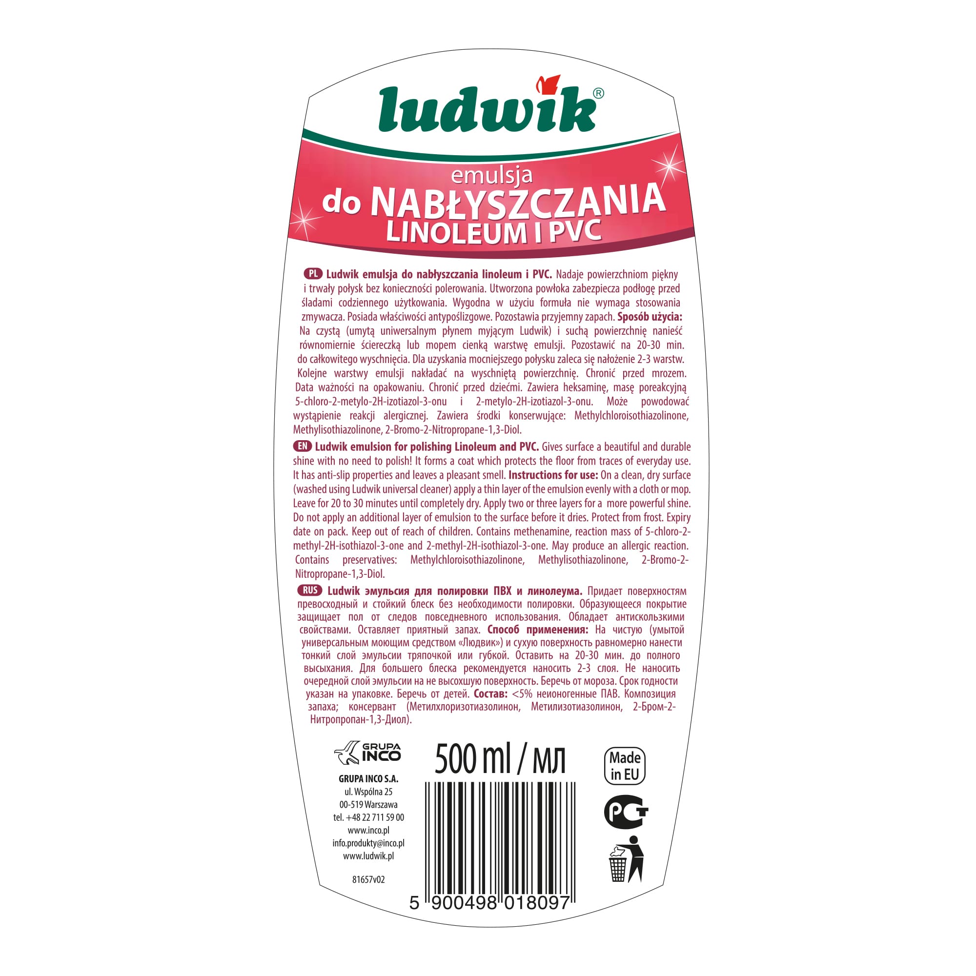 Chronić przed dziećmi. Ludwik emulsja do nabłyszczania linoleum i PCV zawiera heksaminę, masę poreakcyjną 5-chloro-2-metylo-2H-izotiazol-3-onu i 2-metylo-2H-izotiazol-3-onu. Może powodować wystąpienie reakcji alergicznej. Zawiera środki konserwujące: Methylchloroisothiazolinone, Methylisothiazolinone, 2-Bromo-2-Nitropropane-1,3-Diol.