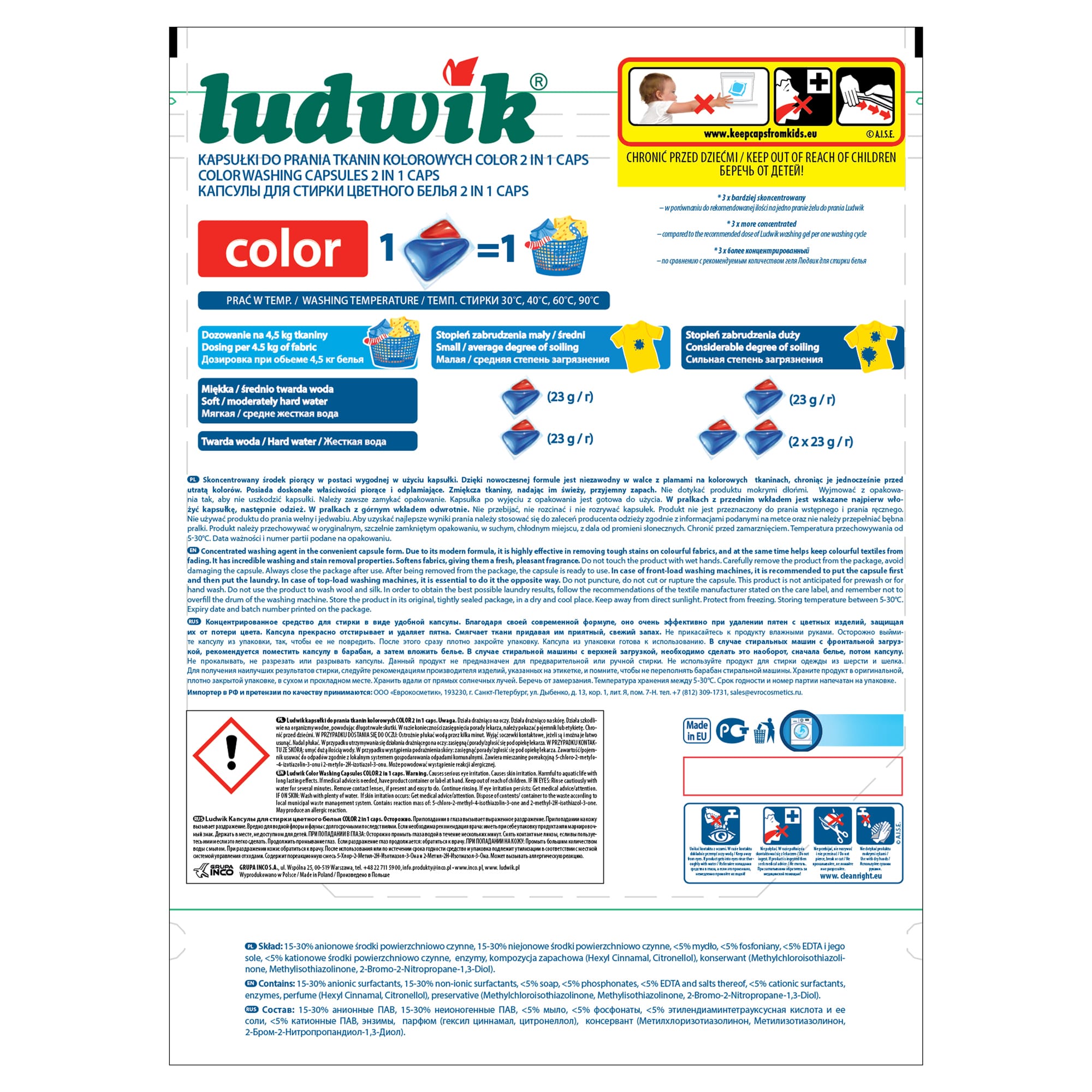 Ludwik kapsułki do prania kolorowych tkanin COLOR 2 in 1 caps skutecznie usuwają uporczywe plamy. Są niezwykle łatwe w stosowaniu, wystarczy przed zapełnieniem bębna pralki wrzucić jedną lub dwie kapsułki, włożyć brudne rzeczy i włączyć odpowiedni cykl prania. Kapsułki także chronią tkaniny przed utratą kolorów, zmiękczają i nadają im długotrwały przyjemny zapach.