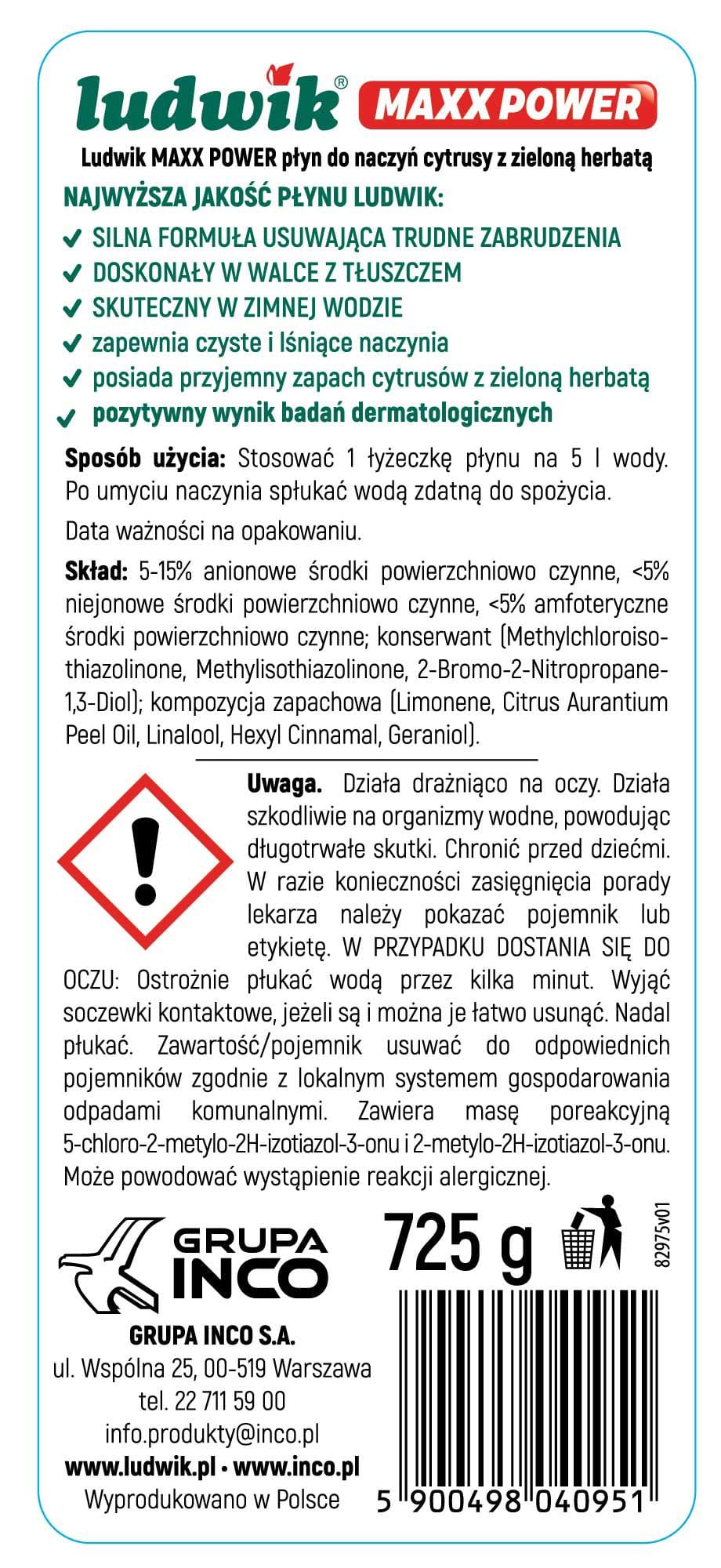 Ludwik MAXX POWER płyn do mycia naczyń cytrusy z zieloną herbatą 725 g
