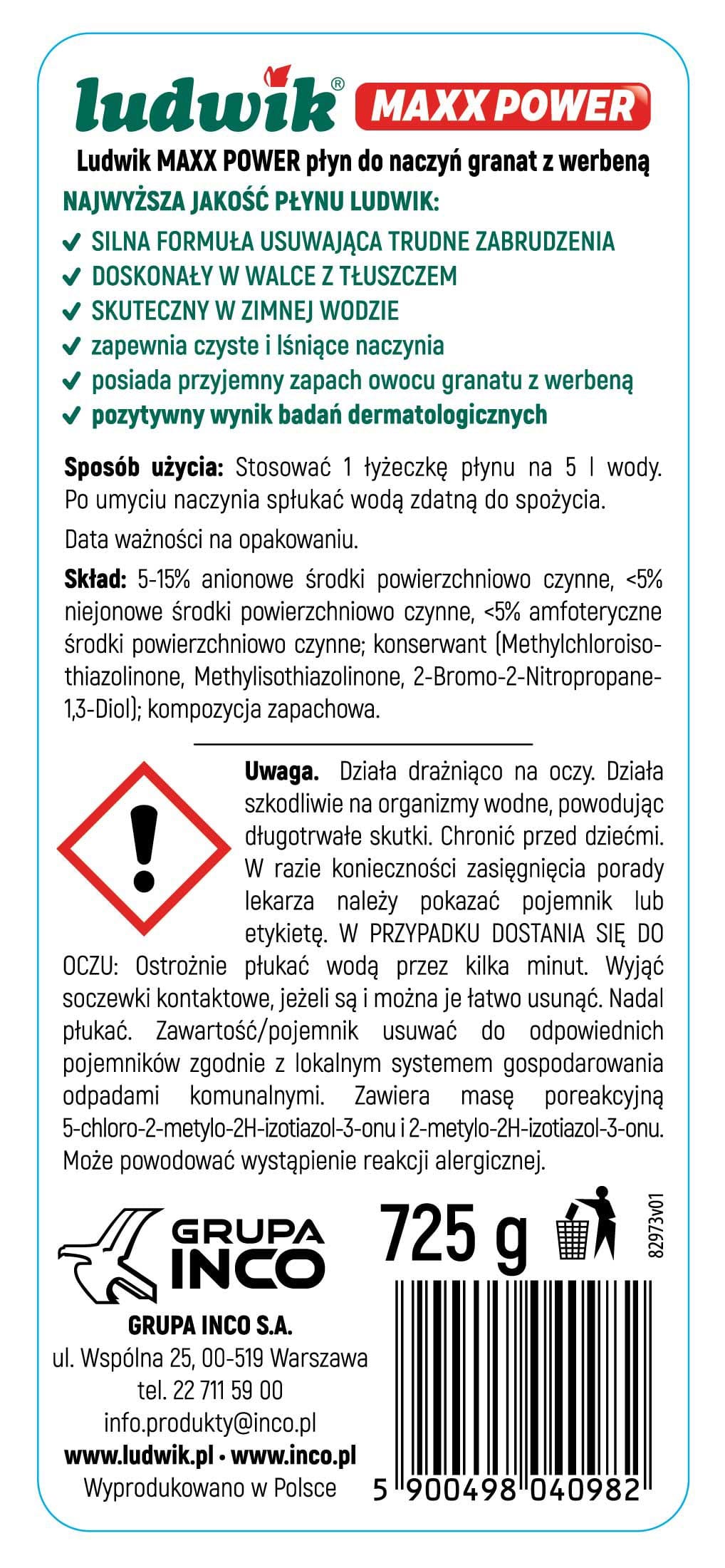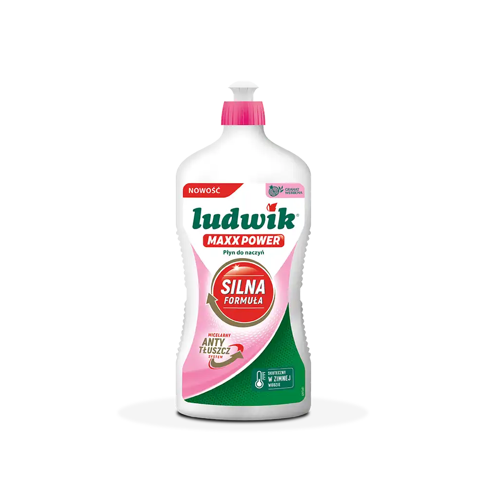 Ludwik MAXX POWER płyn do mycia naczyń granat z werbeną. Nasza skuteczna formuła płynu do mycia naczyń błyskawicznie usuwa tłuszcz, nawet w zimnej wodzie, przywracając naczyniom idealną czystość i blask. Doskonały do codziennego użytku, zapewnia szybkie i efektywne czyszczenie, pozostawiając naczynia świeże i bez tłustych osadów.