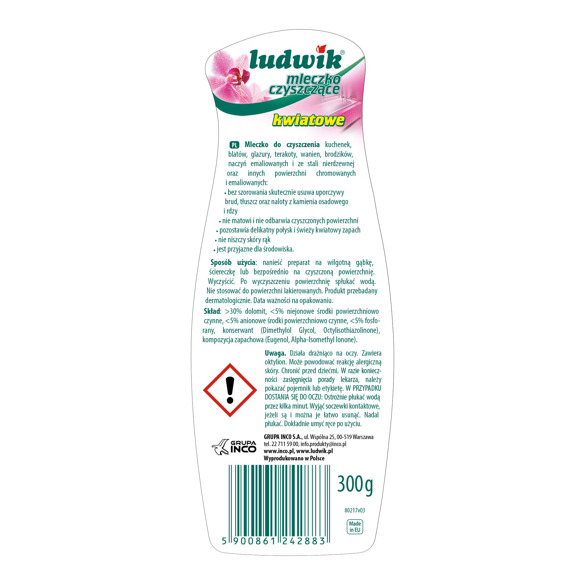 Ludwik mleczko czyszczące kwiatowe 300 g do kuchenek , blatów, glazury, terakoty, wanien, brodzików, naczyń emaliowanych i ze stali nierdzewnej oraz innych powierzchni chromowanych i emaliowanych: