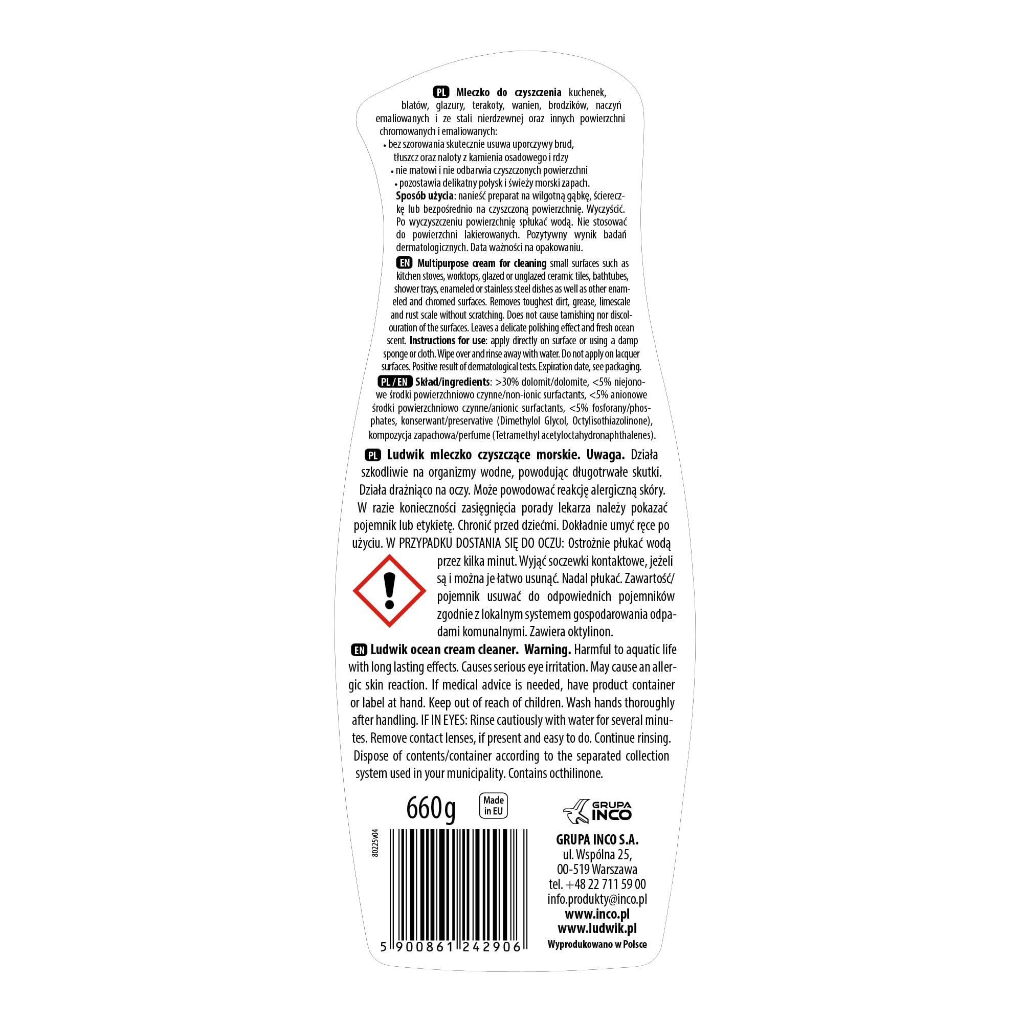 Ludwik morskie mleczko czyszczące do kuchenek, blatów, glazury, terakoty, wanien, brodzików, naczyń emaliowanych i ze stali nierdzewnej oraz innych powierzchni chromowanych i emaliowanych: