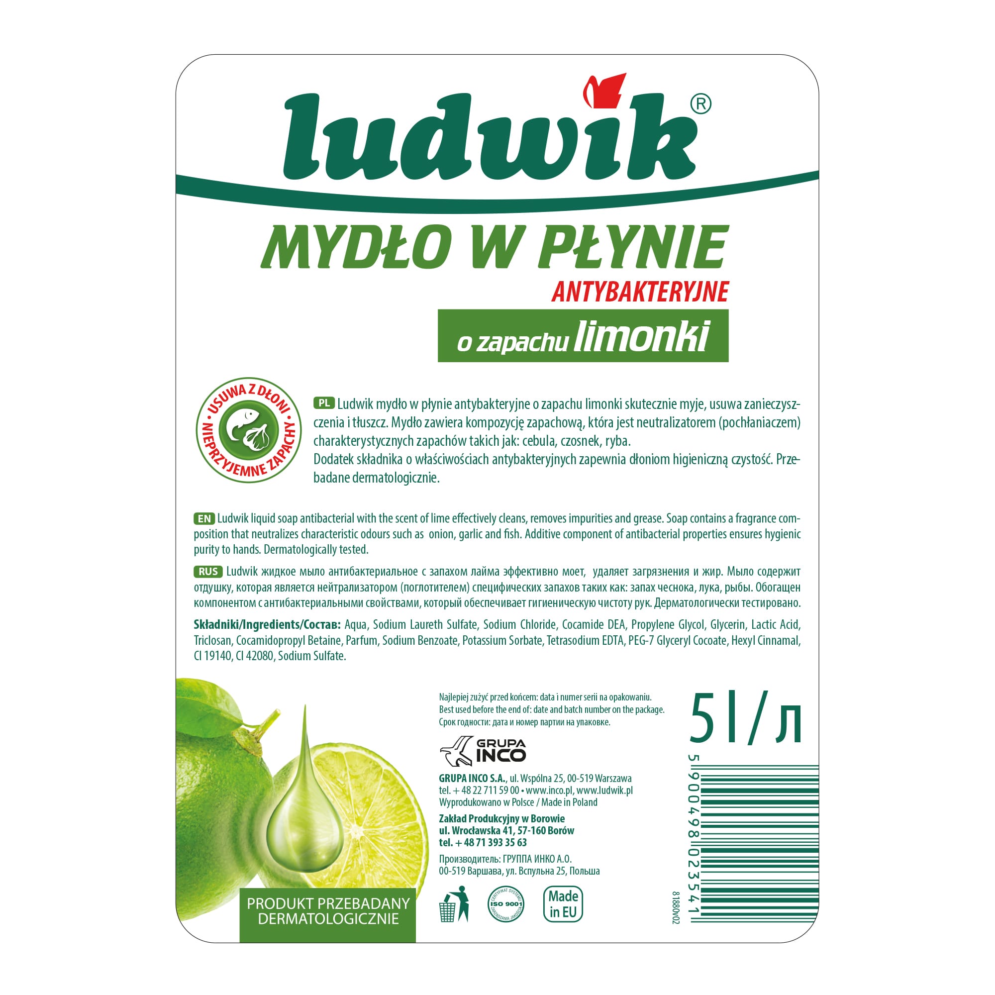 Ludwik mydło antybakteryjne w płynie o zapachu limonki skutecznie myje, usuwa zanieczyszczenia i tłuszcz. Mydło zawiera kompozycję zapachową, która jest neutralizatorem (pochłaniaczem) charakterystycznych zapachów takich jak: cebula, czosnek, ryba. Dodatek składnika o właściwościach antybakteryjnych zapewnia dłoniom higieniczną czystość. Przebadane dermatologicznie.