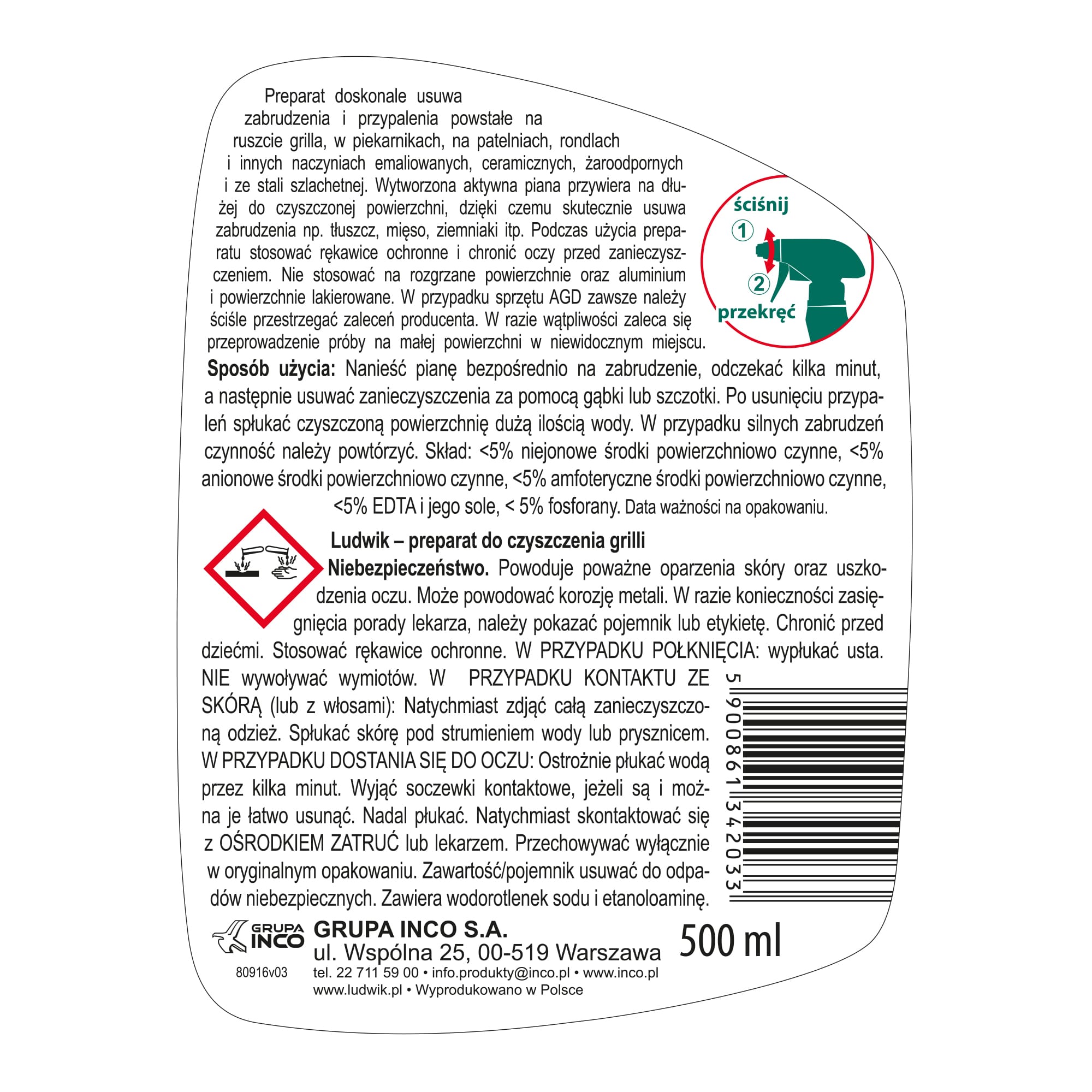 Ludwik płyn do grilla i piekarników skutecznie usuwa uporczywy tłuszcz i resztki jedzenia z rusztów, piekarników. Ale także pomaga w czyszczeniu patelni, rondli, naczyń emaliowanych, ceramicznych, żaroodpornych, ze stali szlachetnej . Dzięki aktywnej pianie działa szybko i skutecznie.
