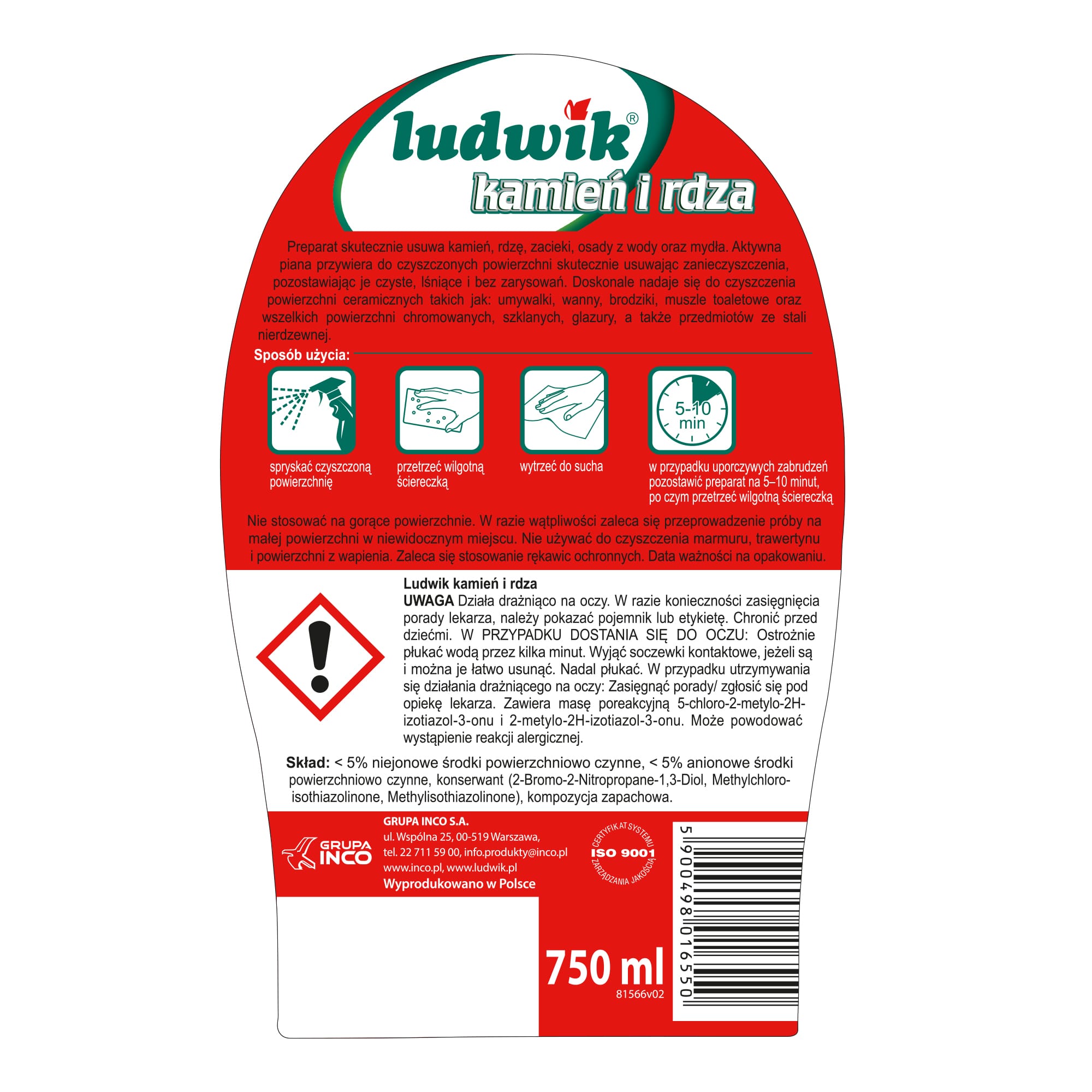 Ludwik płyn do kamienia i rdzy skutecznie usuwa kamień i rdze, zacieki z wody i mydła. Nie pozostawia zacieków ani smug. Przeznaczony do czyszczenia m.in wanny, zlewów, brodzików, muszli toaletowych, glazury, powierzchni chromowanych, szkła i stali.
