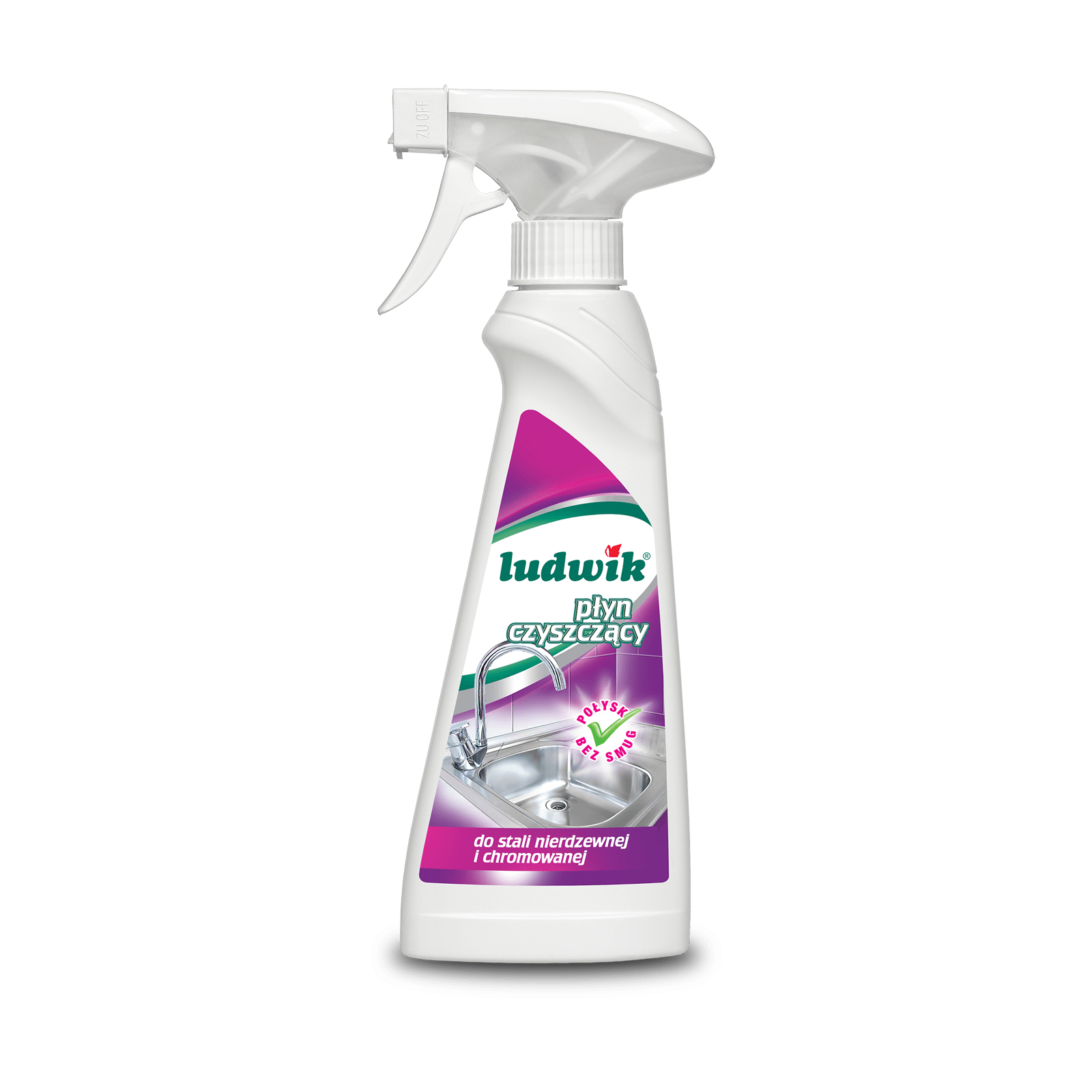 Ludwik płyn do stali nierdzewnej, błyszczącej i chromowanej. Skutecznie usuwa zabrudzenia, ślady palców, zacieki z wody i tłuste plamy. Zawiera aktywną pianę, nie rysuje czyszczonej powierzchni. Nie pozostawia smug i zarysowań. Zapobiega ponownemu przywieraniu zabrudzeń.