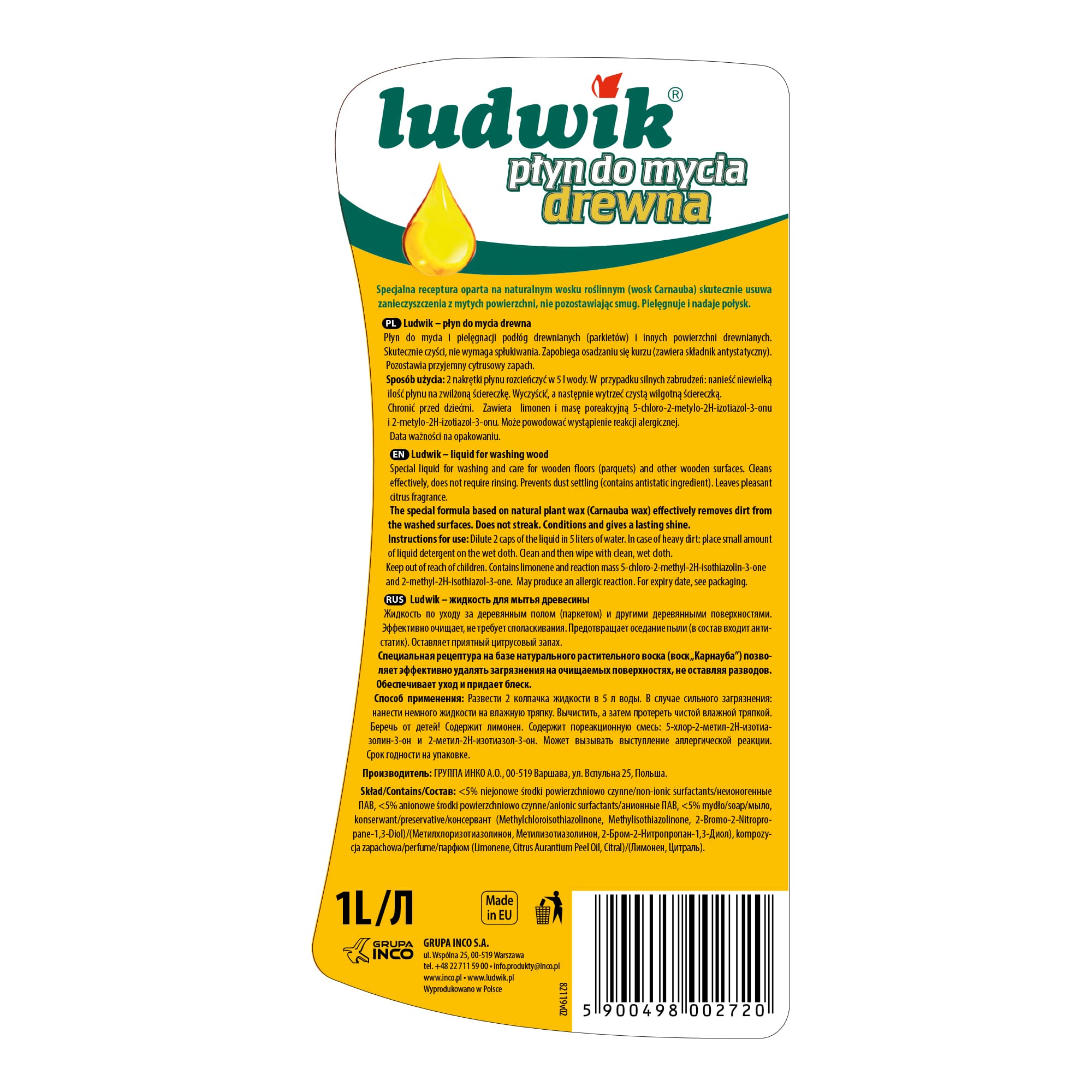 Ludwik płyn do mycia drewna skutecznie czyści powierzchnie, pielęgnując je i nadając im połysk. Nie pozostawia smug i również zapobiega ponownemu osadzaniu się kurzu. Ma przyjemny, cytrusowy zapach.