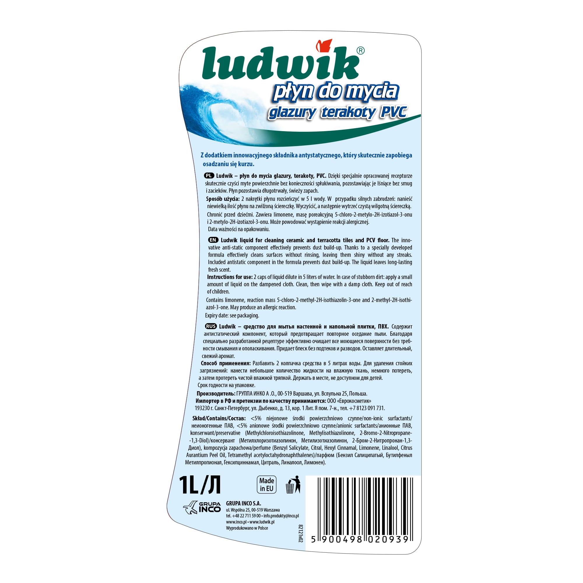 Ludwik płyn do glazury, terakoty, PCV skutecznie czyści myte powierzchnie, także nie pozostawia smug i zacieków. Zapobiega osadzaniu się kurzu. Pozostawia długotrwały, świeży zapach.
