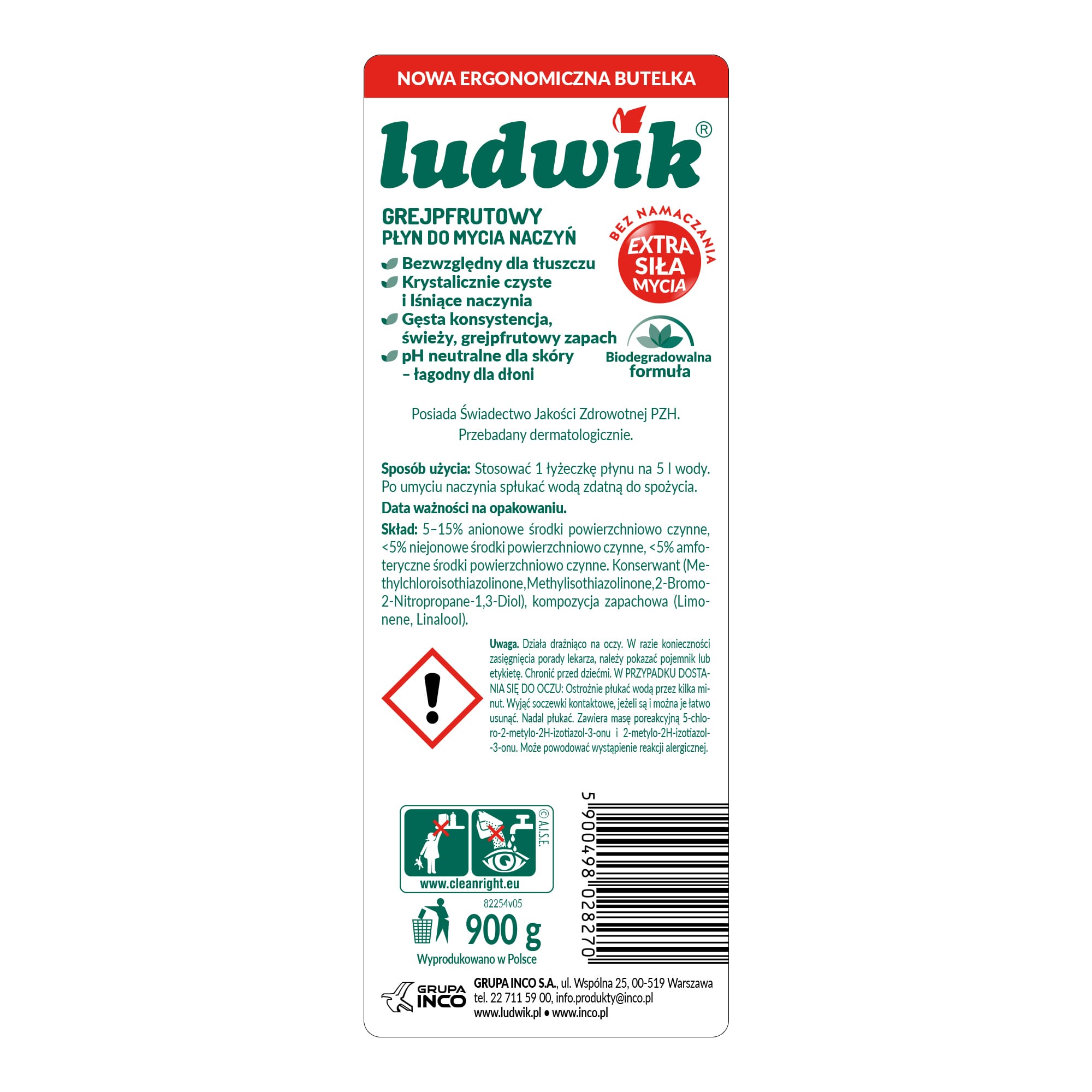 Ludwik do mycia naczyń grejpfrutowy wydajny płyn do mycia naczyń o świeżym grejfrutowym zapachu. Nowa, bardziej skuteczna formuła myjącą zapewnia czyste i lśniące naczynia. Posiada także biodegradowalną formułę i jest bezwzględny dla tłuszczu, pH neutralne dla skóry – łagodny dla dłoni. Zawiera wyciąg z trawy cytrynowej.