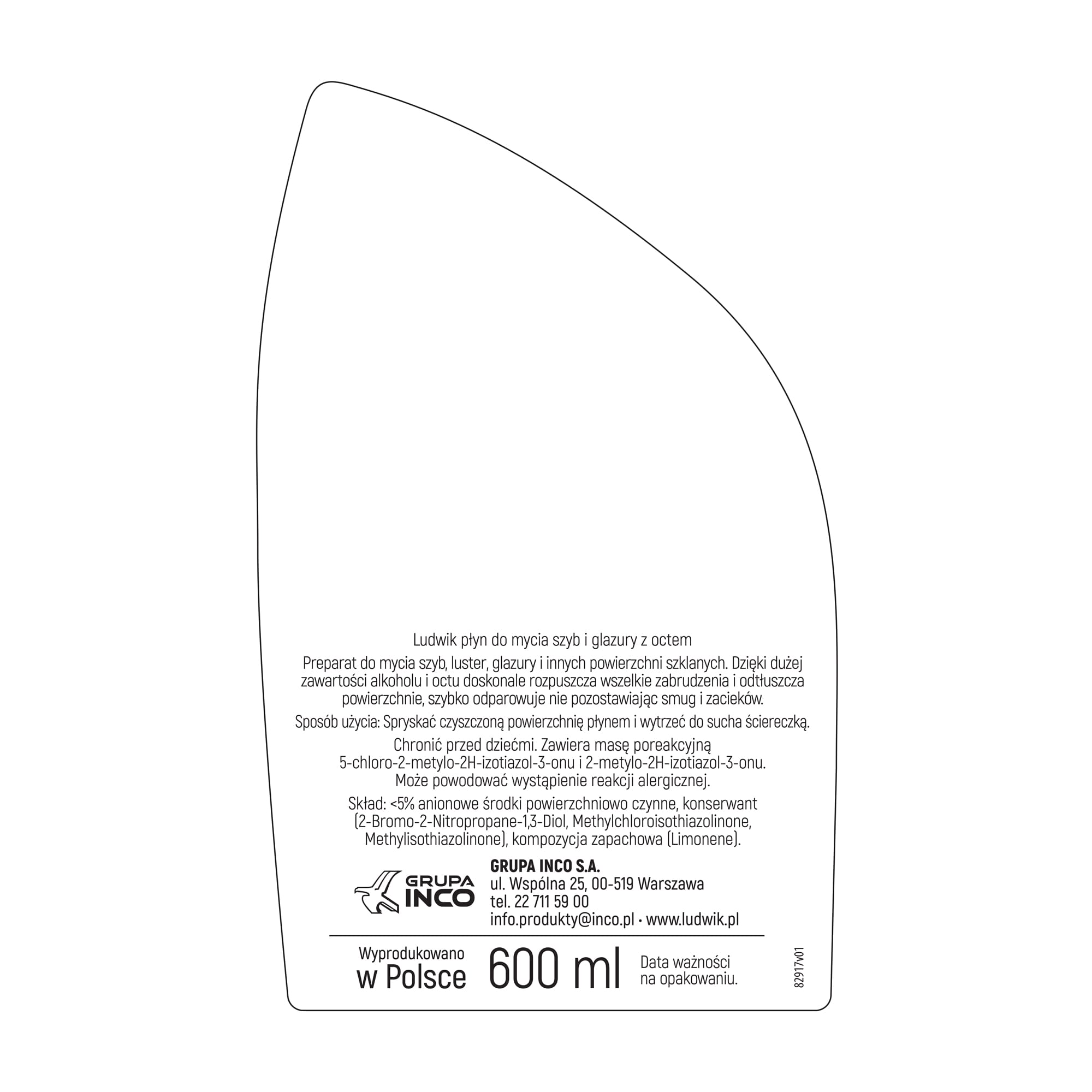 Ludwik płyn do szyb i glazury z octem. Nie pozostawia smug i zacieków. Skutecznie rozpuszcza zabrudzenia, odtłuszcza czyszczone powierzchnie i szybko odparowuje.