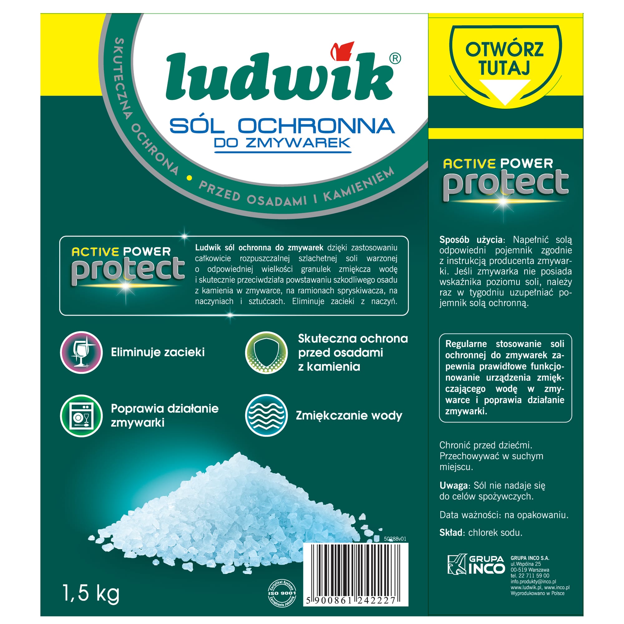 Ludwik sól ochronna do zmywarek chroni przed osadzaniem się kamienia w zmywarce i na naczyniach. Skutecznie zmiękcza wodę oraz kompleksowo dba o zmywarkę,