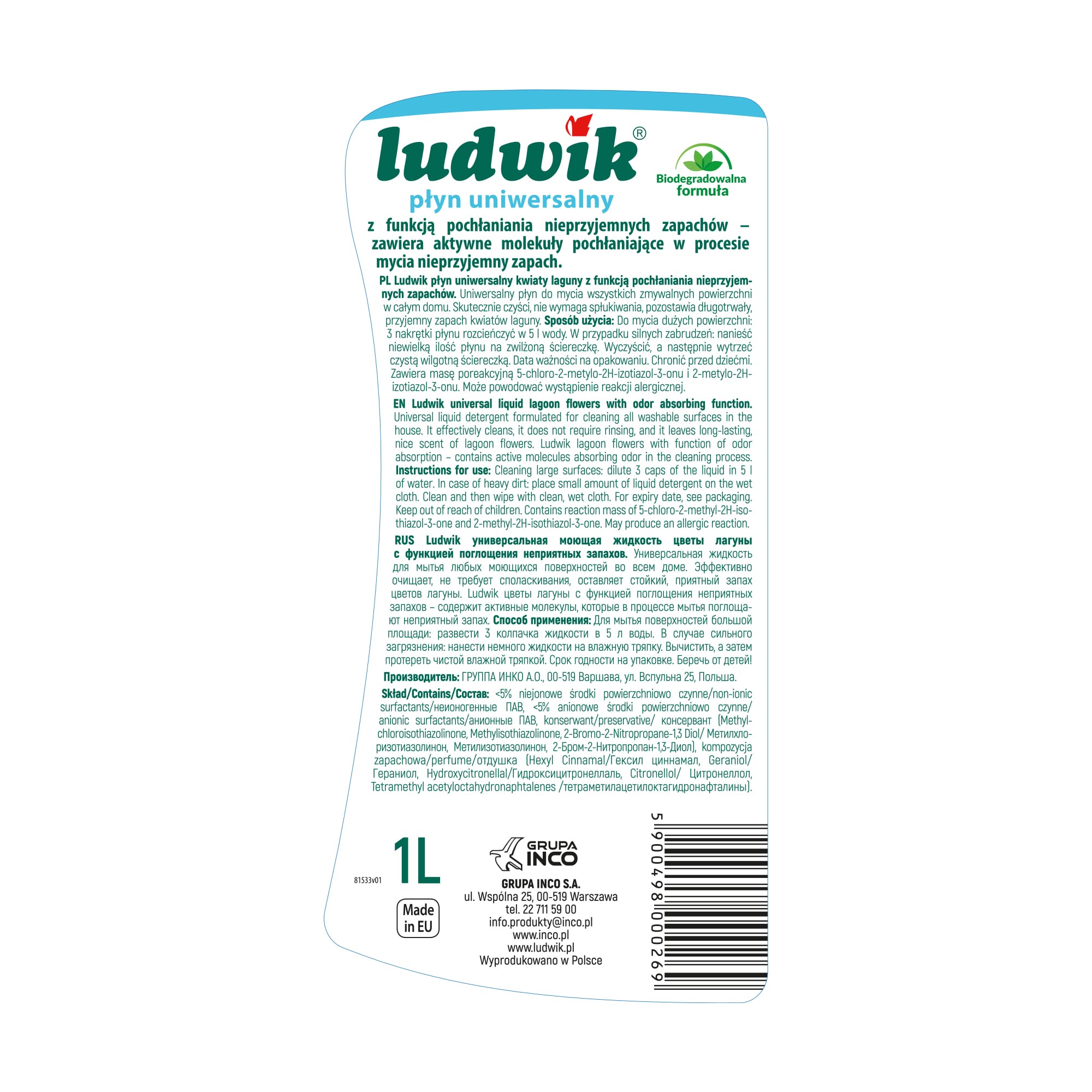 Ludwik uniwersalny neutralizator zapachów do czyszczenia wszystkich powierzchni zmywalnych w całym domu. Neutralizuję brzydkie zapachy. Skutecznie usuwa brud i tłuszcz. Zapewnia czystość i połysk bez smug. Pozostawia świeży zapach kwiatów laguny.