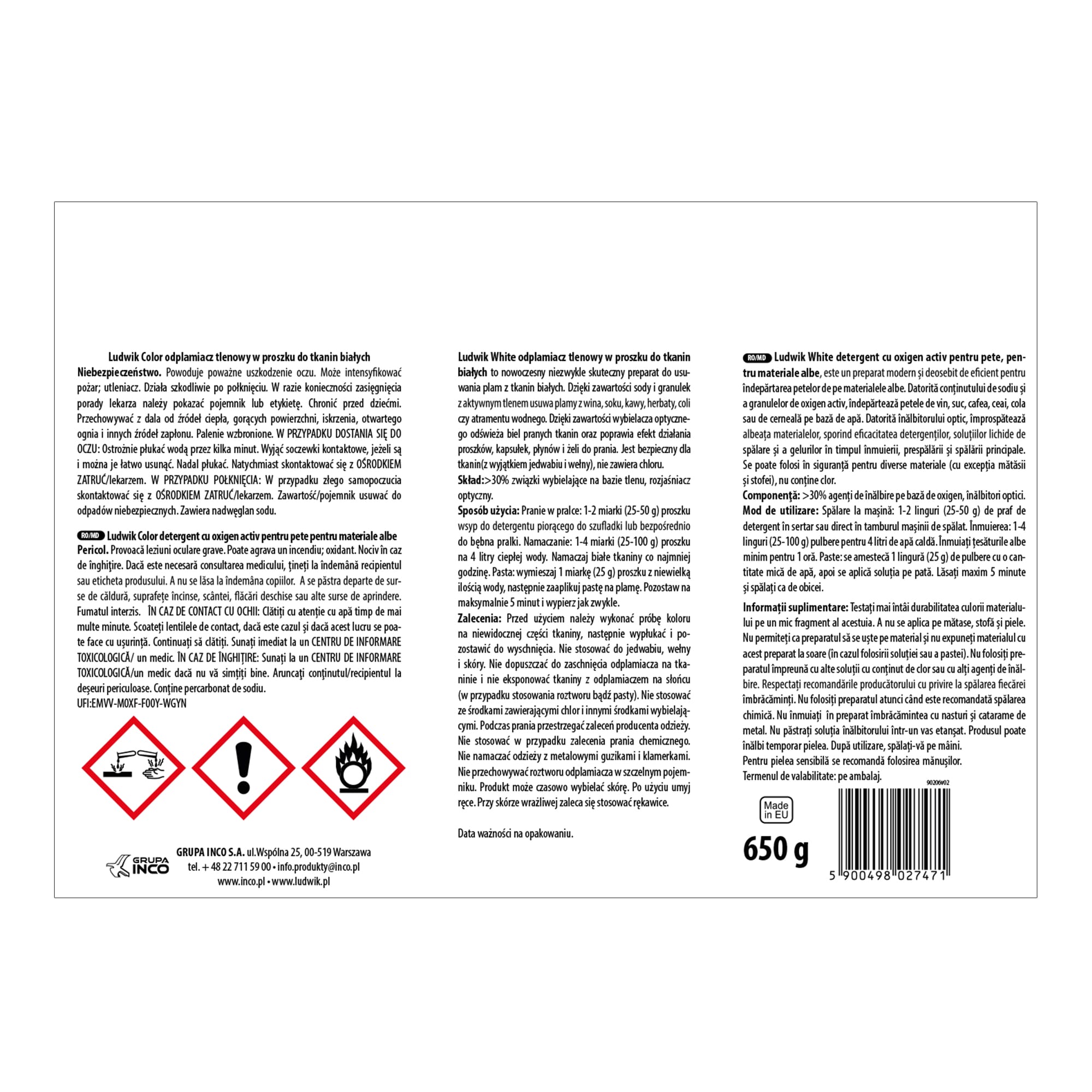 Ludwik White odplamiacz tlenowy w proszku do tkanin białych. Usuwa plamy, nie odbarwia tkanin. Bezpieczny dla tkanin ( z wyjątkiem wełny i lnu ). Nie zawiera chloru i szkodliwych fosforanów.