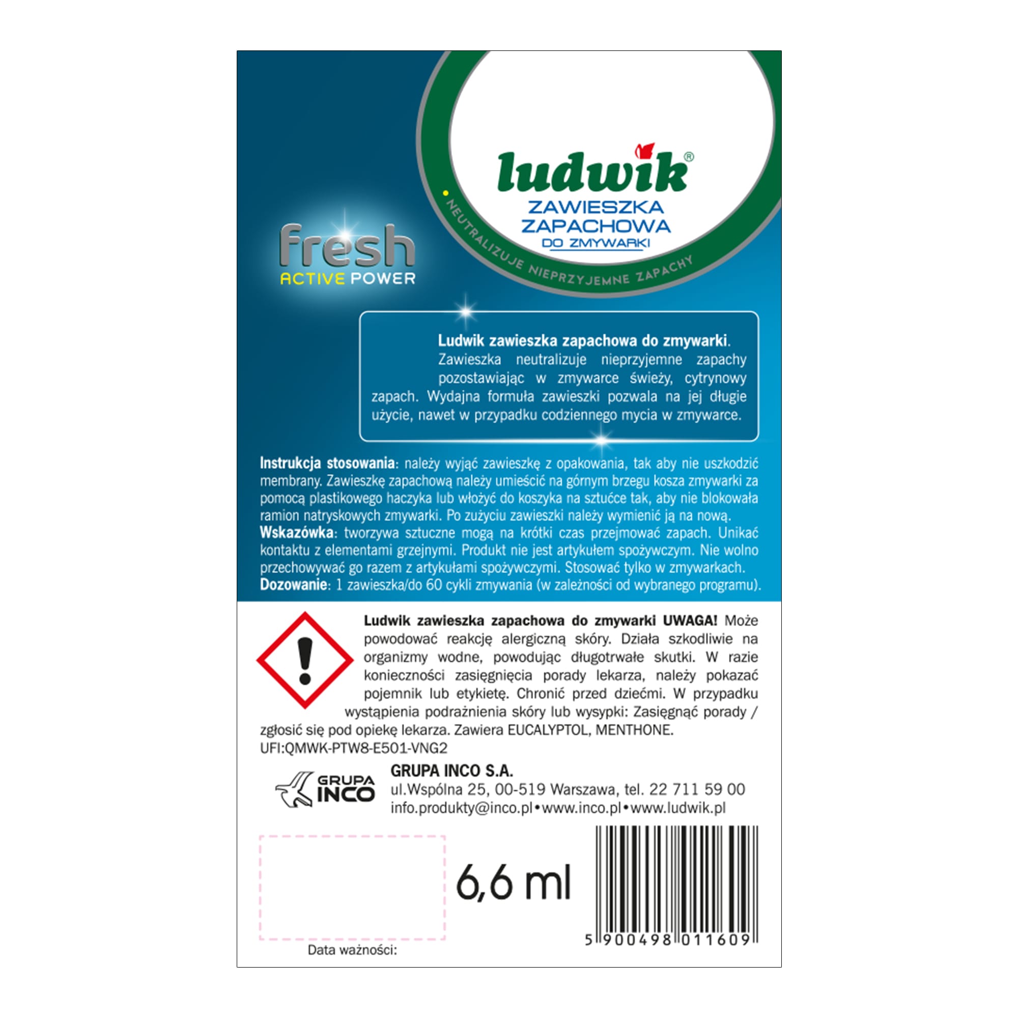 Ludwik zawieszka zapachowa do zmywarki usuwa nieprzyjemne zapachy. Posiada wydajną formułę, pozostawia świeży cytrynowy zapach. Wystarcza na około 60 cykli mycia.
