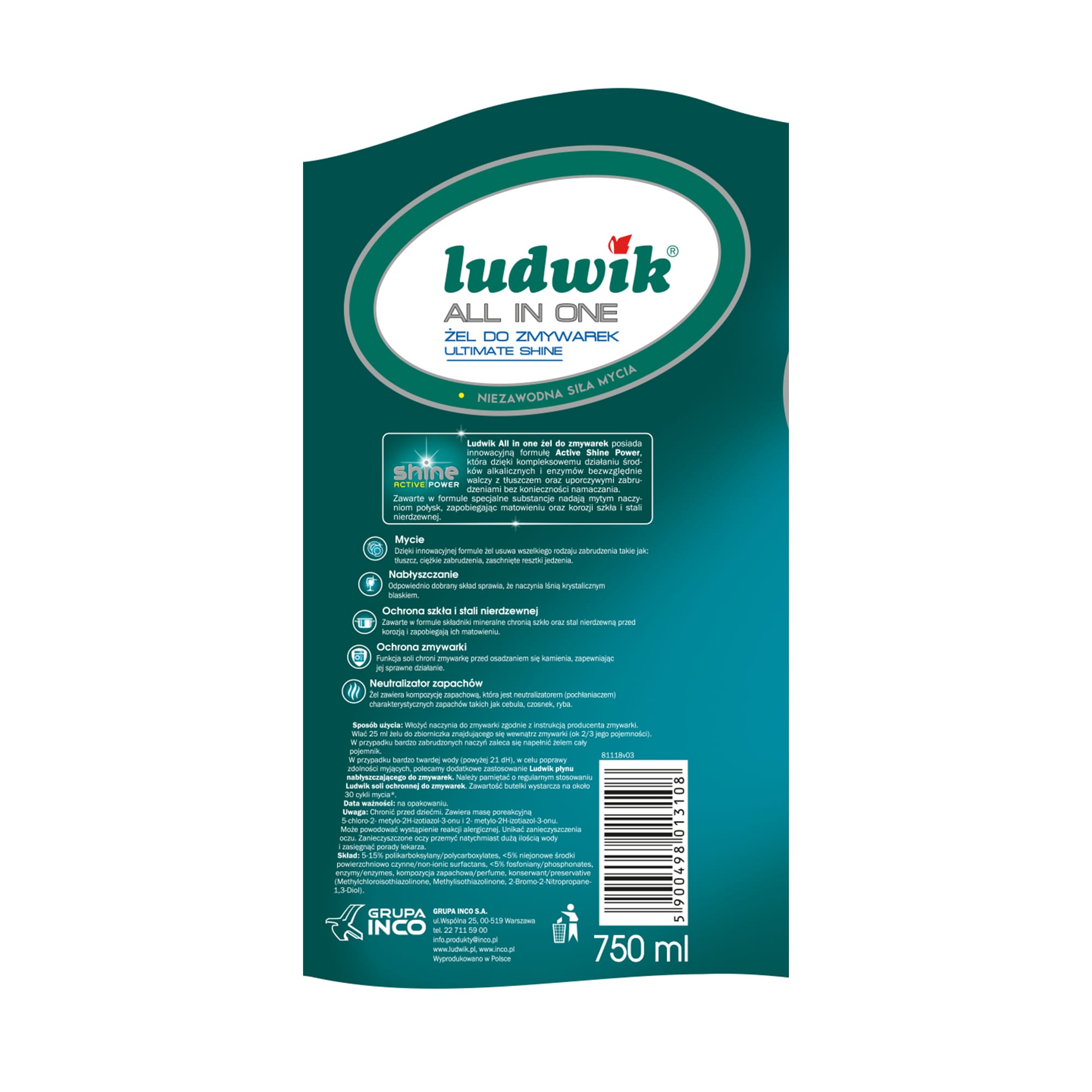 Ludwik żel do zmywarek All in One posiada innowacyjną formułę Active Shine Power, która dzięki kompleksowemu działaniu środków alkalicznych i enzymów bezwzględnie walczy z tłuszczem i przypaleniami. Efektywnie usuwa nawet najbardziej uporczywe zabrudzenia bez konieczności namaczania i nadaję połysk. Zawarte w formule specjalne substancje zapobiegają matowieniu oraz korozji szkła i stali nierdzewnej.