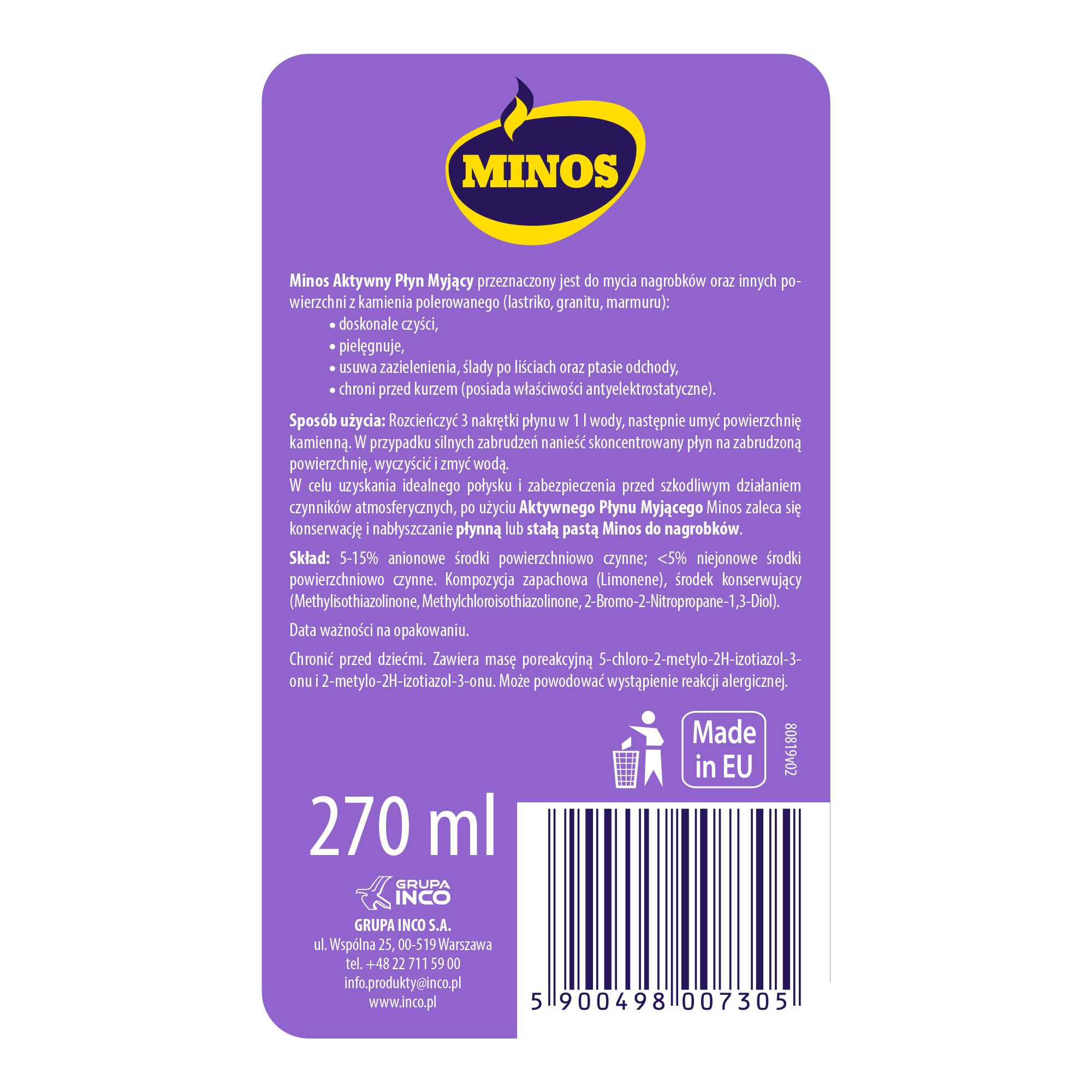 Rozcieńczyć 3 nakrętki płynu w 1 l wody, następnie umyć powierzchnię kamienną. W przypadku silnych zabrudzeń nanieść skoncentrowany płyn na zabrudzoną powierzchnię, wyczyścić i zmyć wodą. W celu uzyskania idealnego połysku i zabezpieczenia przed szkodliwym działaniem czynników atmosferycznych, po użyciu Aktywnego Płynu Myjącego Minos zaleca się konserwację i nabłyszczanie płynną lub stałą pastą Minos do nagrobków.