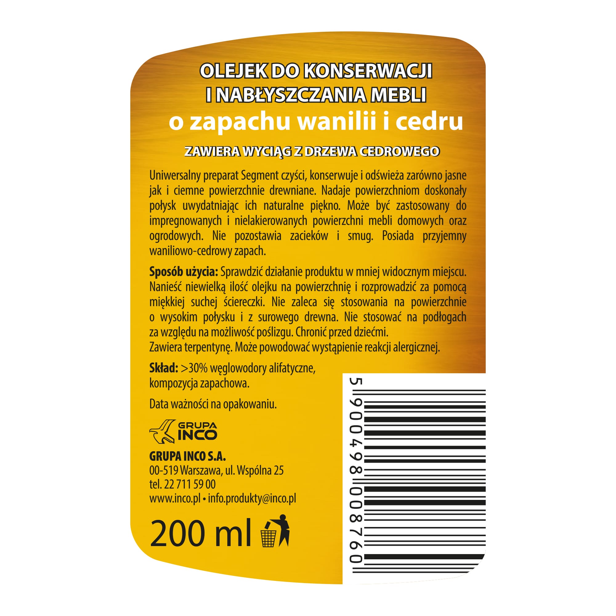 Segment olejek do konserwacji i nabłyszczania mebli o zapachu wanilii i cedru, zawiera wyciąg z drzewa cedrowego. Uniwersalny preparat Segment czyści, konserwuje i odświeża zarówno jasne